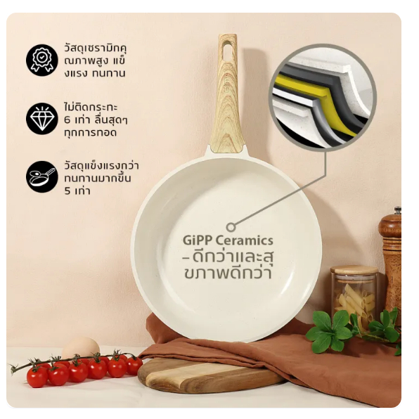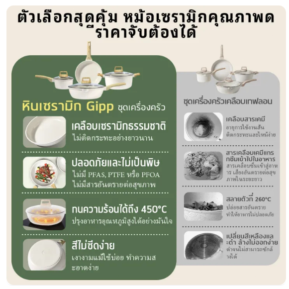 GIPP ชุดเครื่องครัวเซรามิค 14ชิ้น กระทะผัด หม้อซุป กระทะก้นลึก PFAS& PTFE& PFOA ฟรีเหมาะสําหรับเตาทั้งหมด (แก๊ส, ไฟฟ้า)