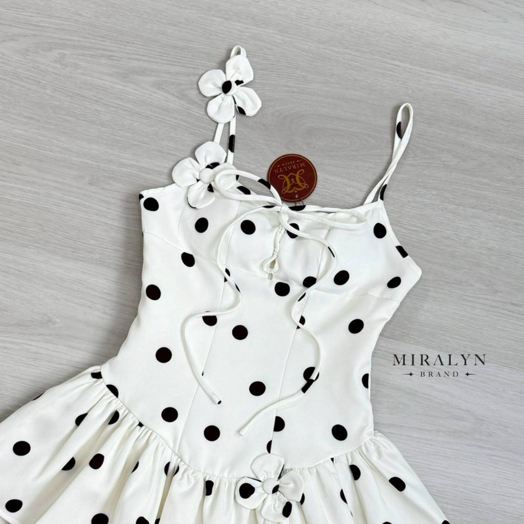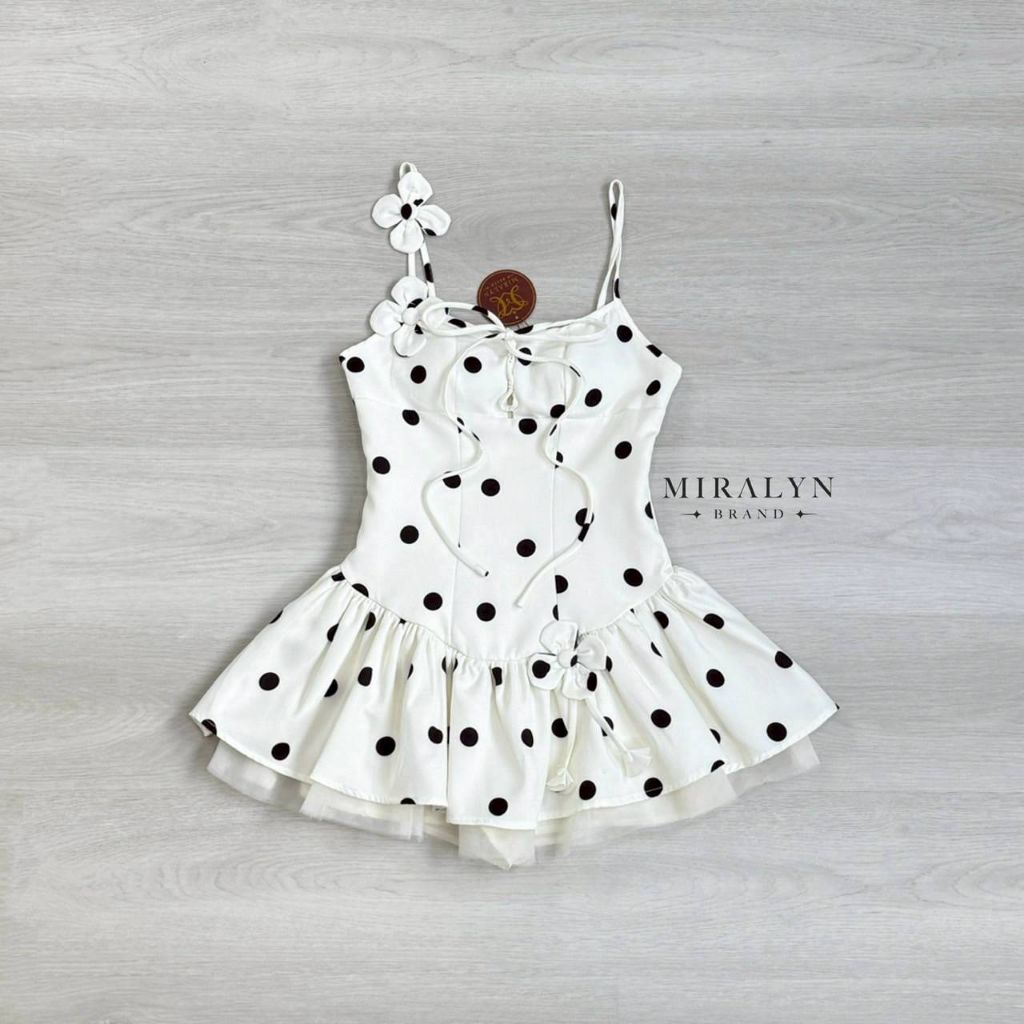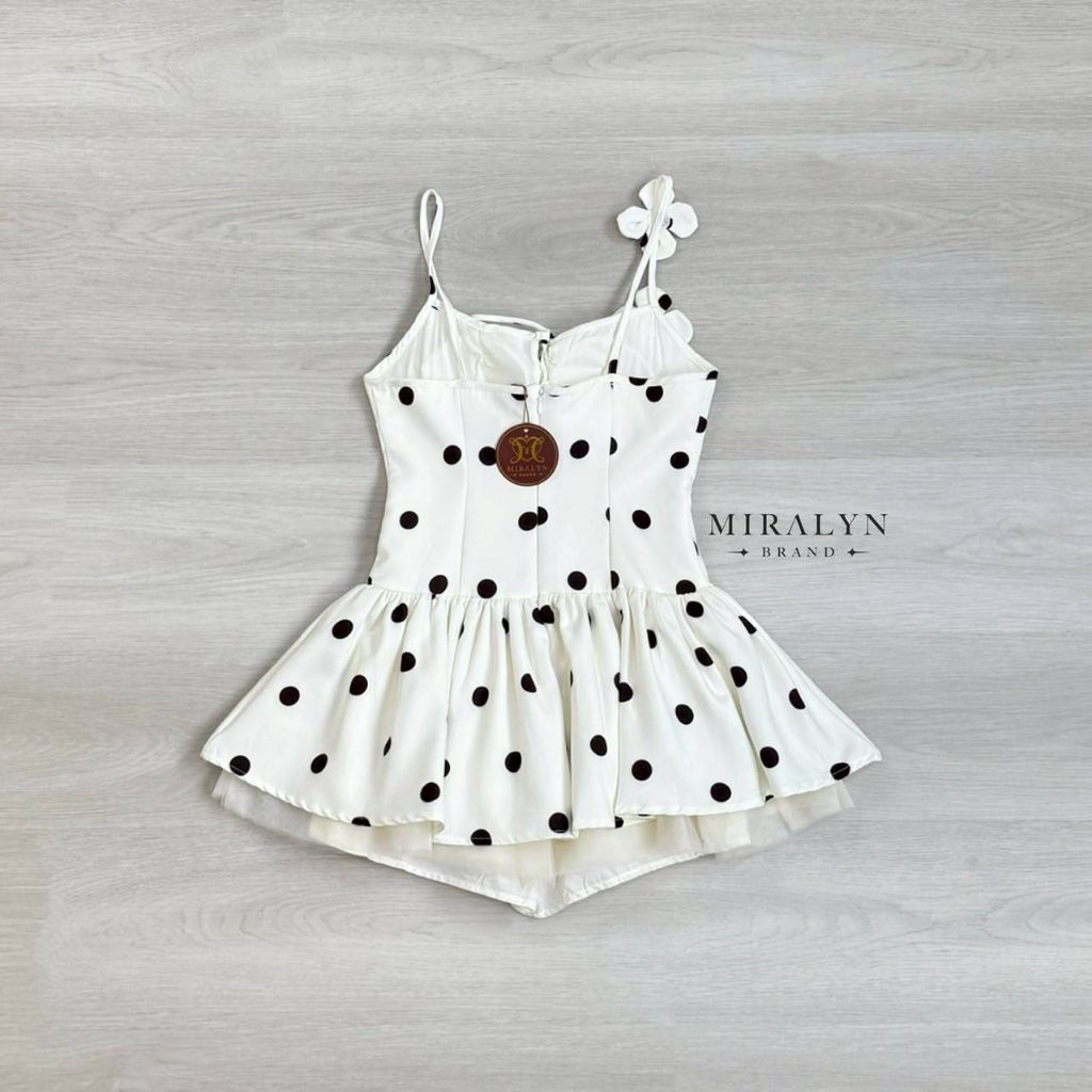 Miralyn จั้มมินิเดรสสายเดี่ยวสีขาวลาย polka dot ทรงน่ารักมาก สายแต่งด้วยดอกไม้สีขาว
