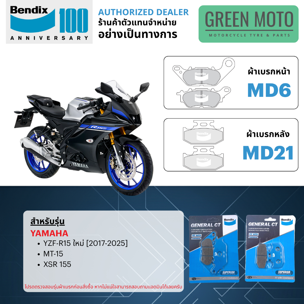 ผ้าเบรค BENDIX จัดชุดสำหรับ YAMAHA YZF-R15 ทุกรุ่น เบรคหน้า-หลัง รหัส MD6, MD25, MD21 ของแท้