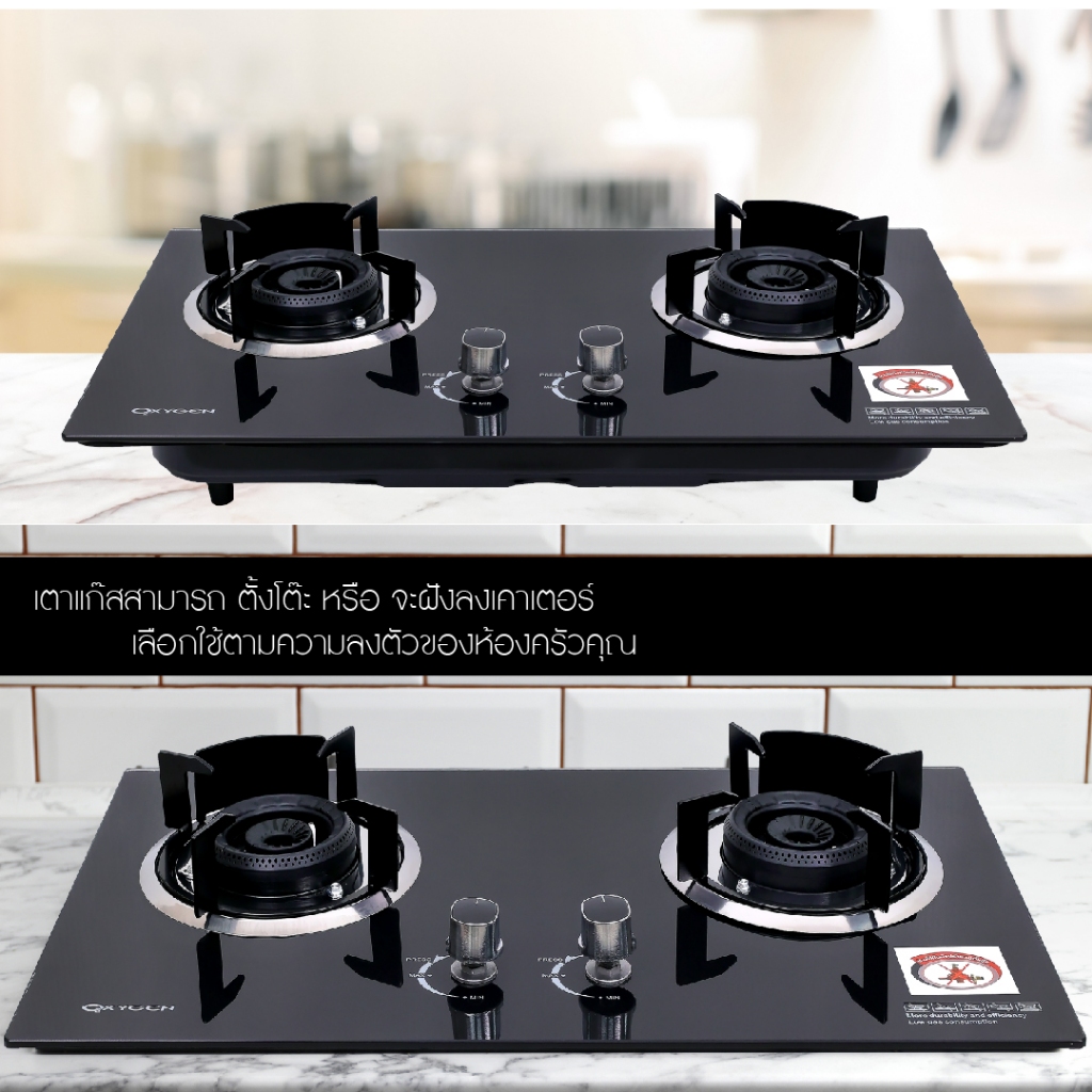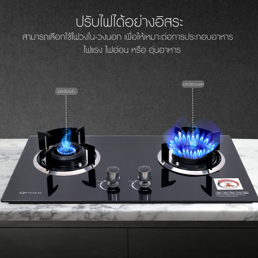 OXYGEN เตาแก๊ส แบบฝัง หรือวางพื้นโต๊ะ หัวคู่หน้ากระจก (หัวฟู่) รุ่น X-5100 เตาฝัง เตาแก๊สหน้ากระจก