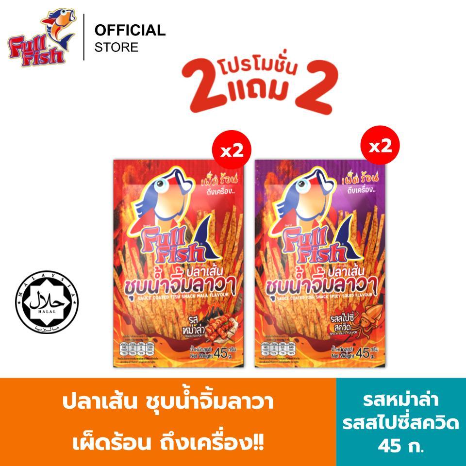 (2 แถม 2) FullFish ปลาเส้นชุบน้ำจิ้มลาวา รวม 4 ซอง ขนาด 45 กรัม รวม 2 มีให้เลือก 2 รสชาติ (รสสไปซี่สควิด, รสหม่าล่า)