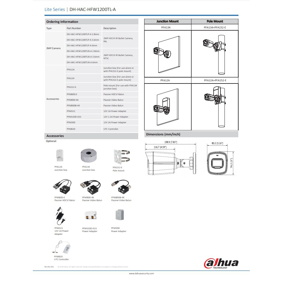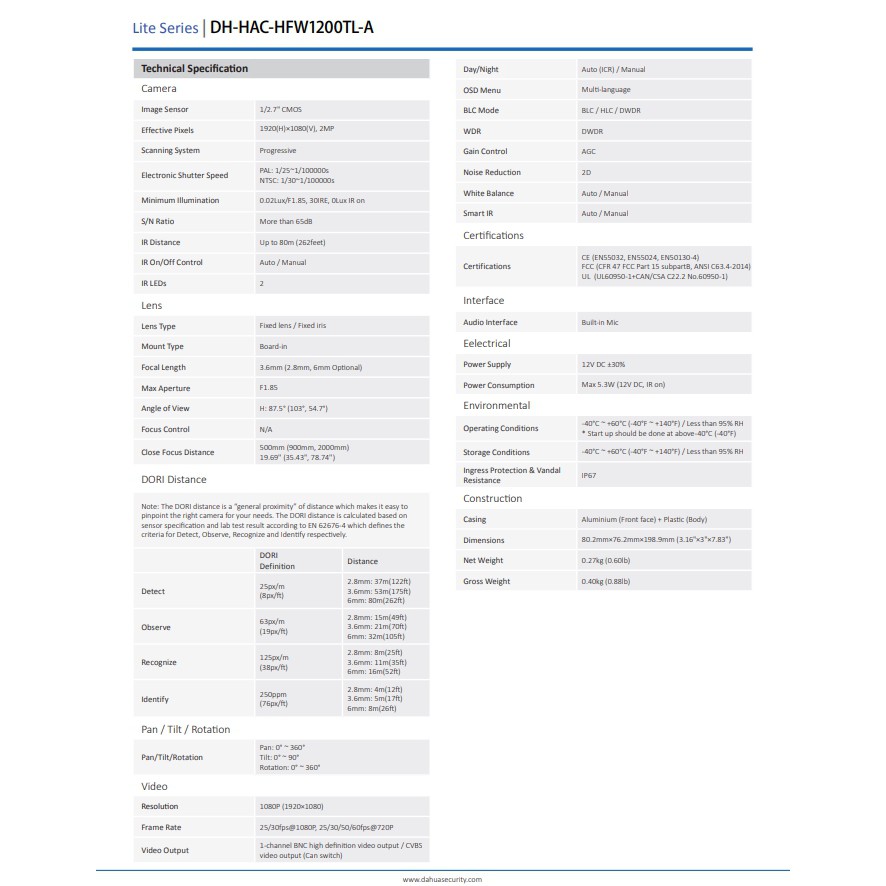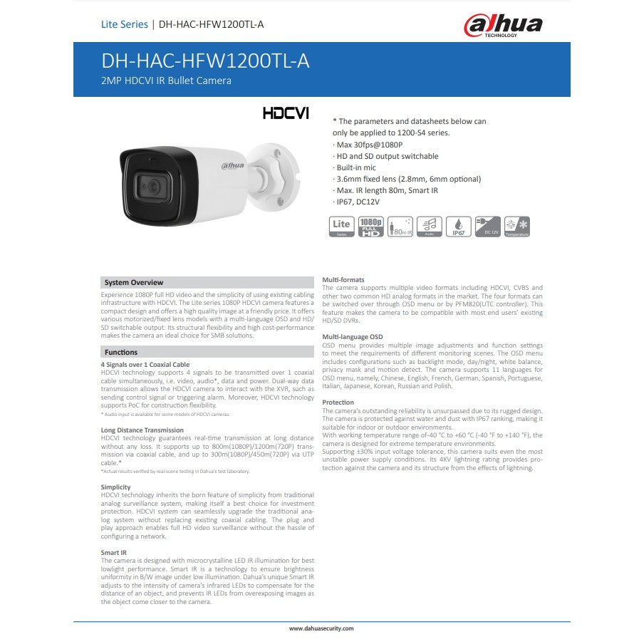 กล้องวงจรปิด DAHUA IR Bullet Camera 2MP เลนส์ 3.6mm รุ่น HFW1200TL-A (มีไมค์ในตัว บันทึกภาพและเสียง)