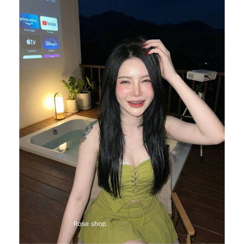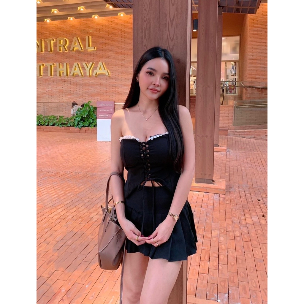 #Roseshop เซท 2 ชิ้น เกาะอกแต่งขอบลูกไม้ สีผ้าพื้น เสริมฟองน้ำเชือกอก กระโปรงจับจีบรอบมีซับในตัว ทรงเป้ะ