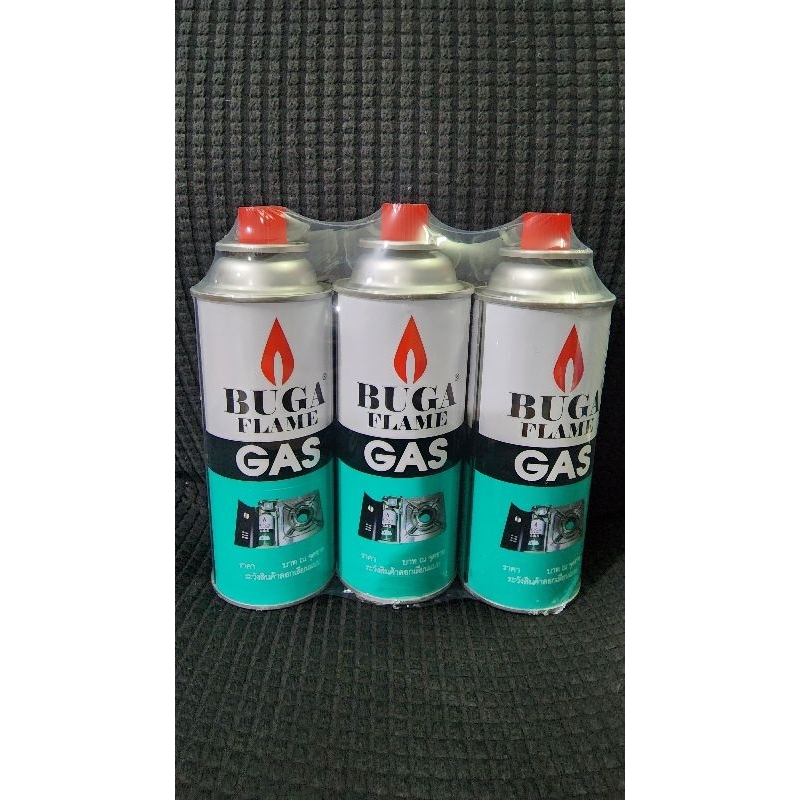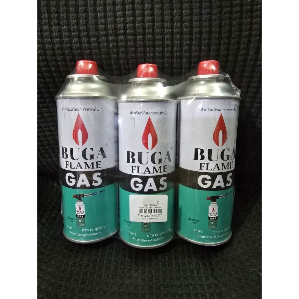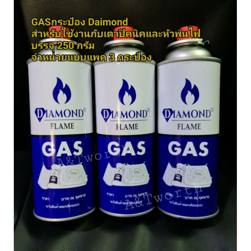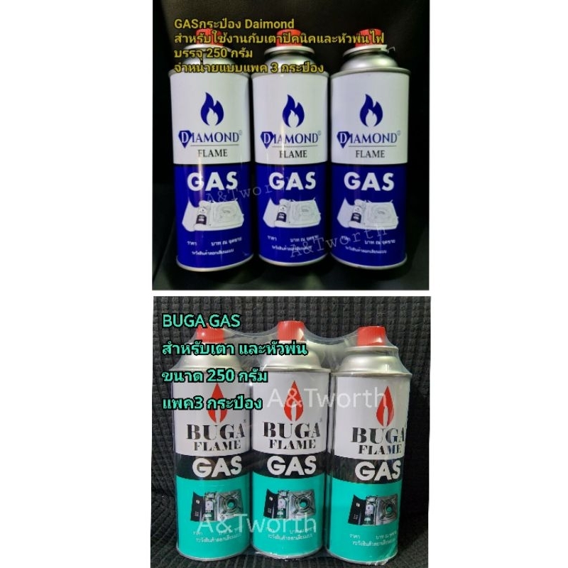 GASกระป๋อง Buga และ Daimond สำหรับใช้งานกับเตาปิคนิคและไฟแช็ค และเบรินอาหารด้วยหัวพ่นบรรจุ 250กรัมจำหน่ายแบบแพคและเดี่ยว