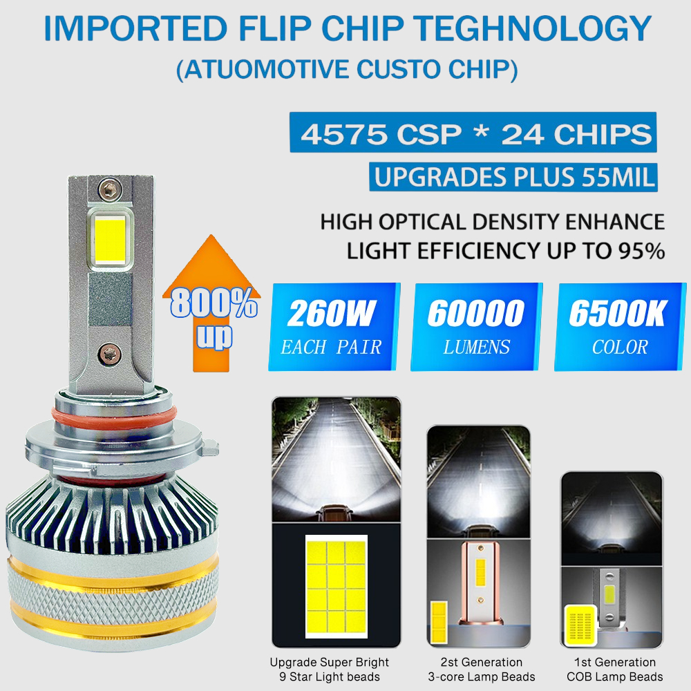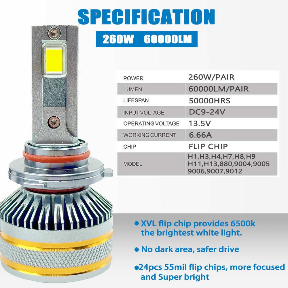 หลอดไฟหน้า LED รถยนต์ G125 พลังสูง 260W 60,000LM แสงขาว 6500K รองรับรถยนต์ 12V ทุกรุ่น
