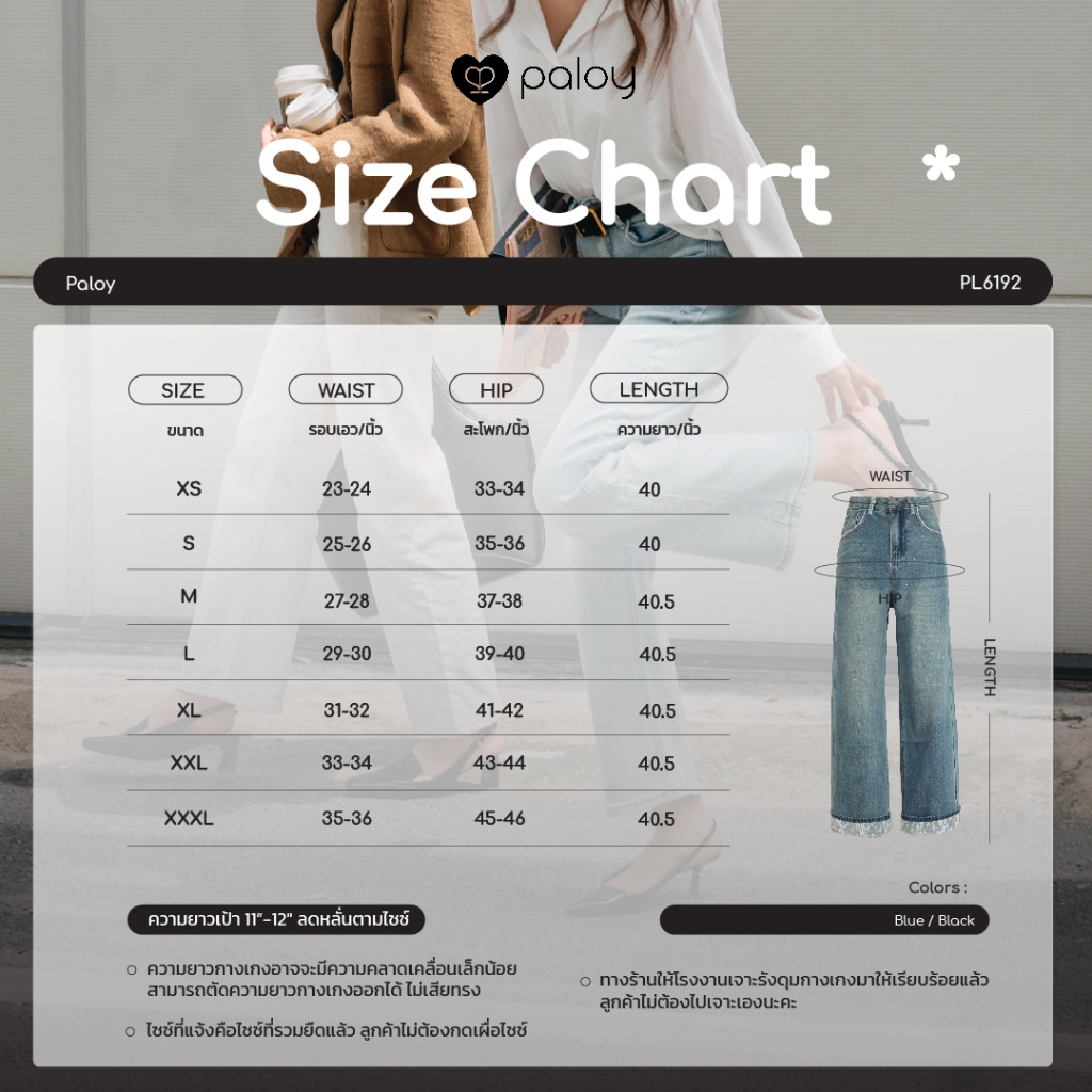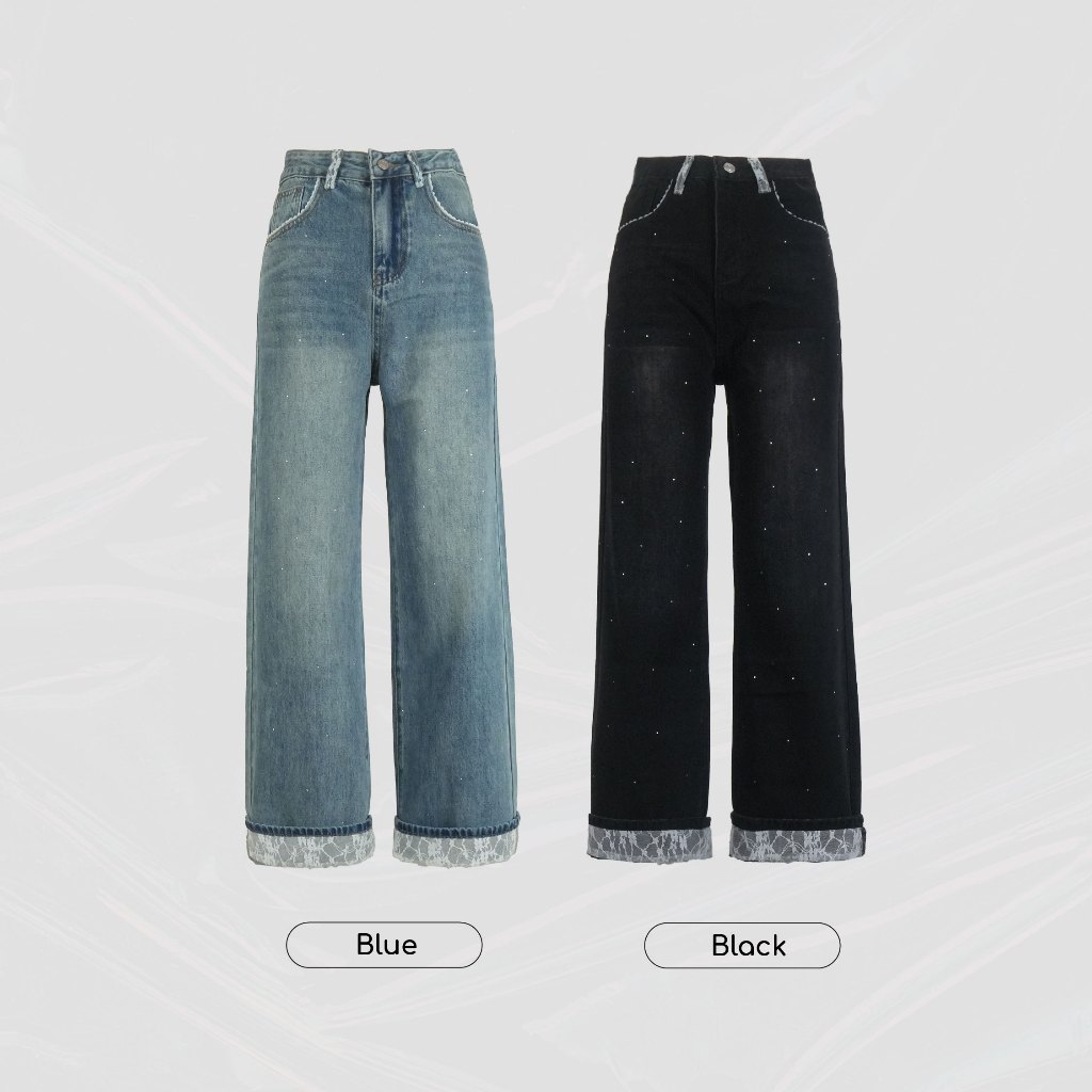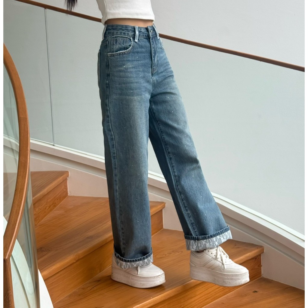 Paloy - PL6192 กางเกงยีนส์ขากระบอกกลาง พับขาแต่งฉลุลูกไม้ กระเป๋าหลังหัวใจ