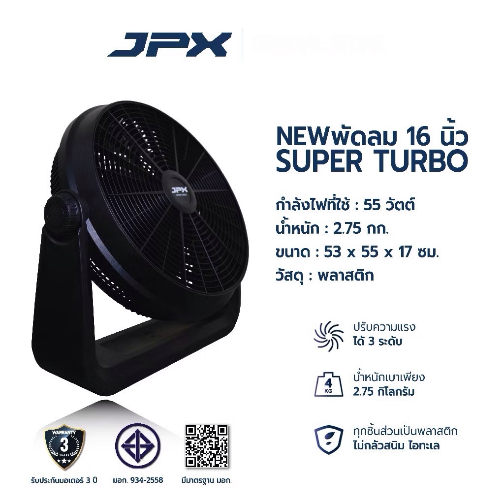 พัดลม JPX 16"Table Fan Super Turbo รุ่นใหม่ ขนาด 16 นิ้ว พัดลมแค้มป์ปิ้ง ปรับความแรงได้3ระดับ