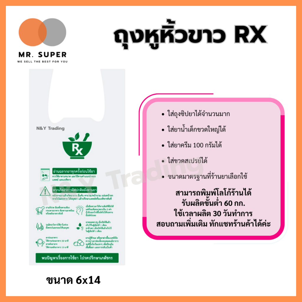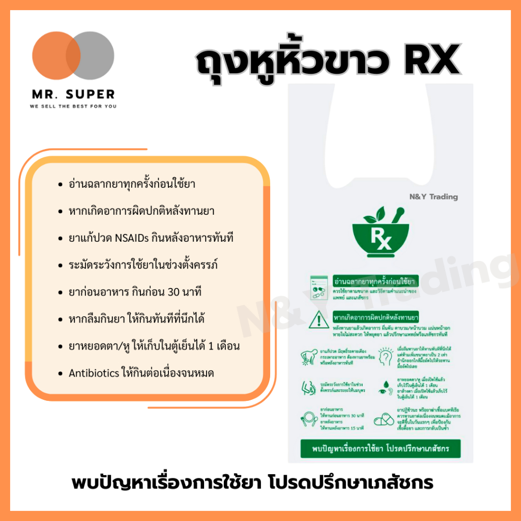 ถุงหูหิ้ว RX สำหรับร้านยา/คลินิก ถุงใส่ยา ถุงพลาสติก Food Grade มีคำเตือน | ขนาด 5x11 / 6x14 นิ้ว