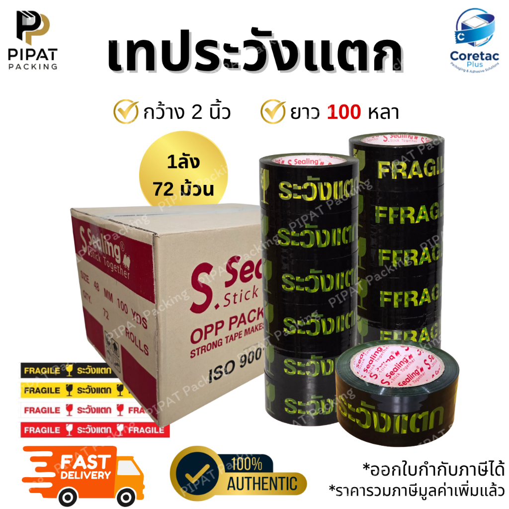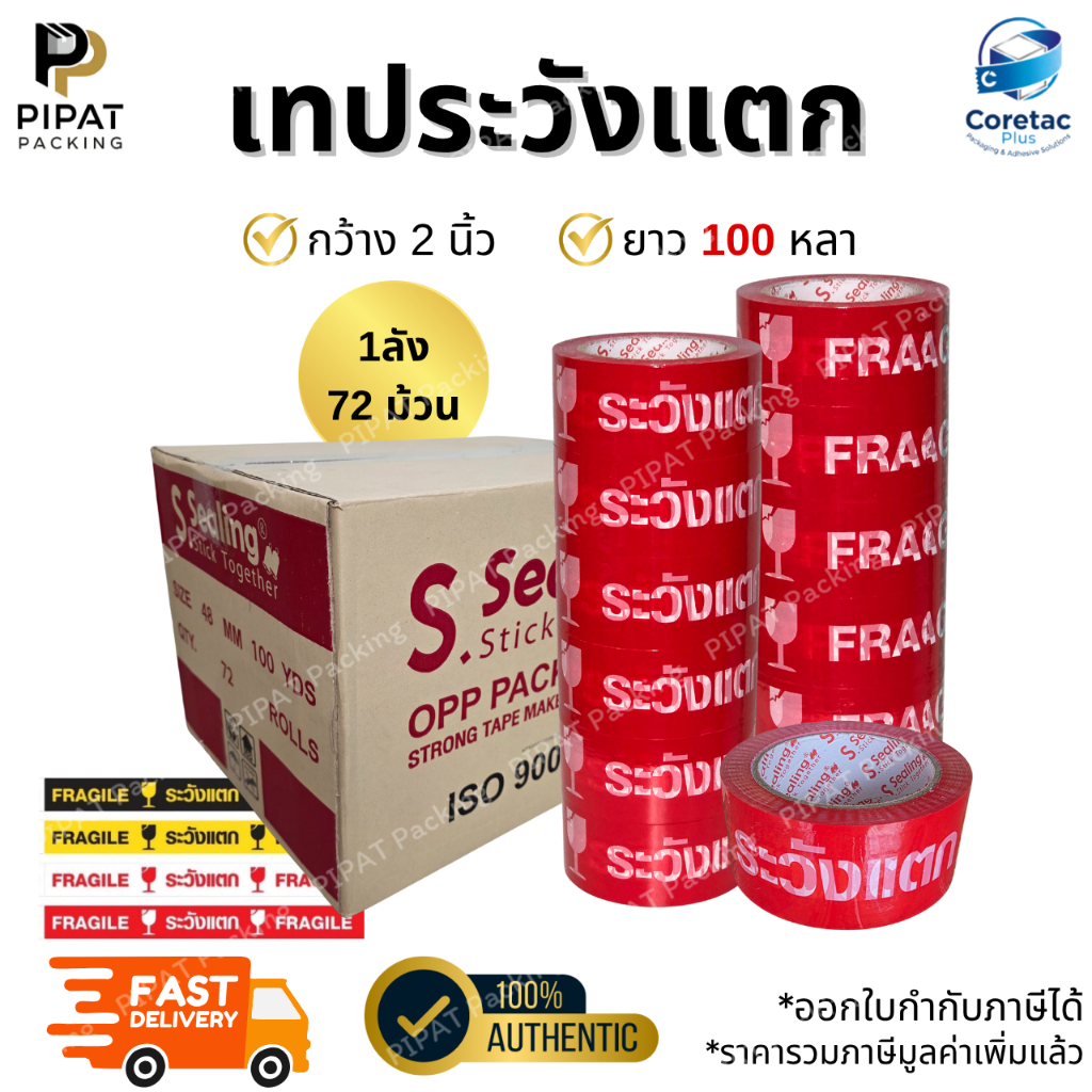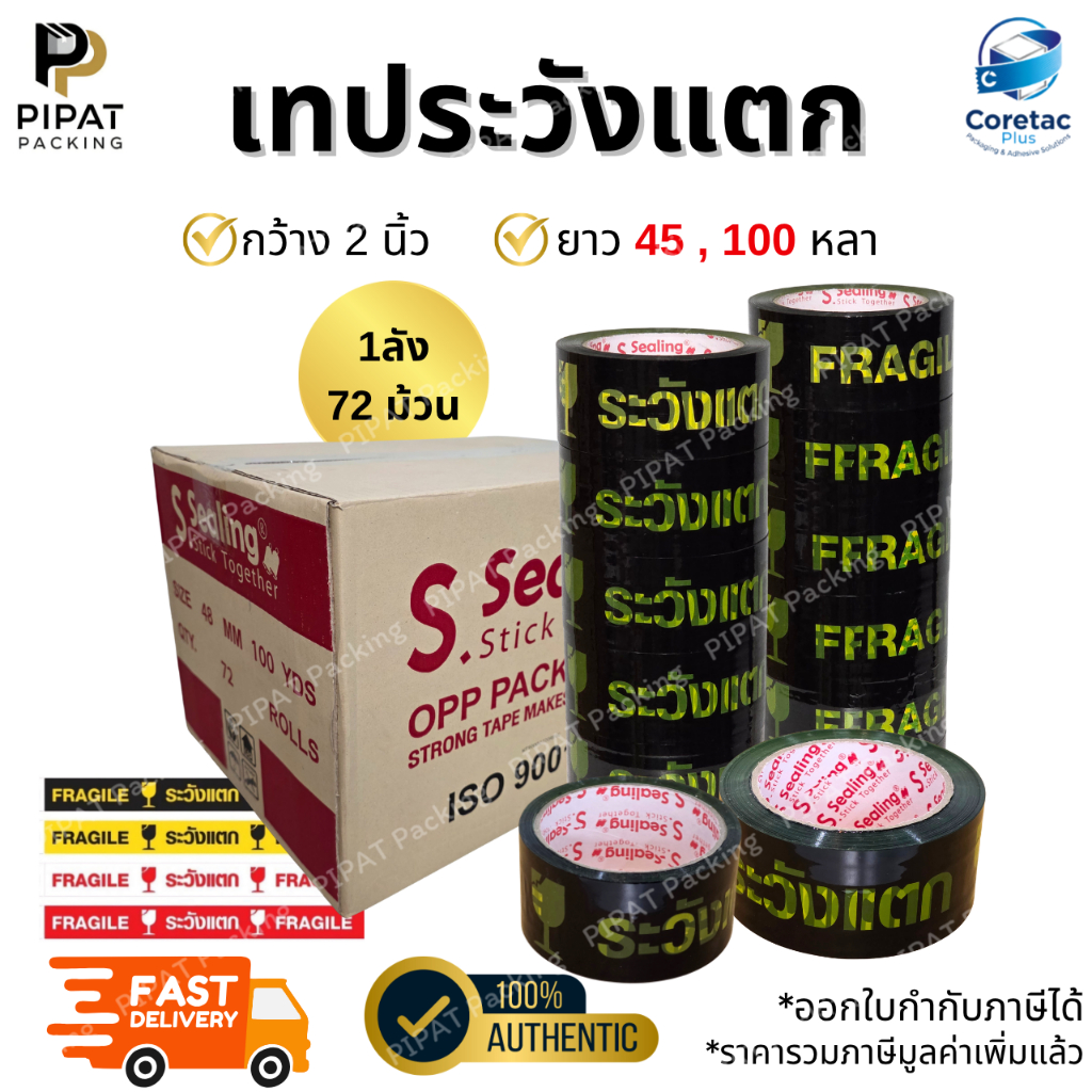 เทประวังแตก ยกลัง 72ม้วน หนา 45mic. กาวเหนียว ติดแน่น เทปปิดกล่องคุณภาพสูง