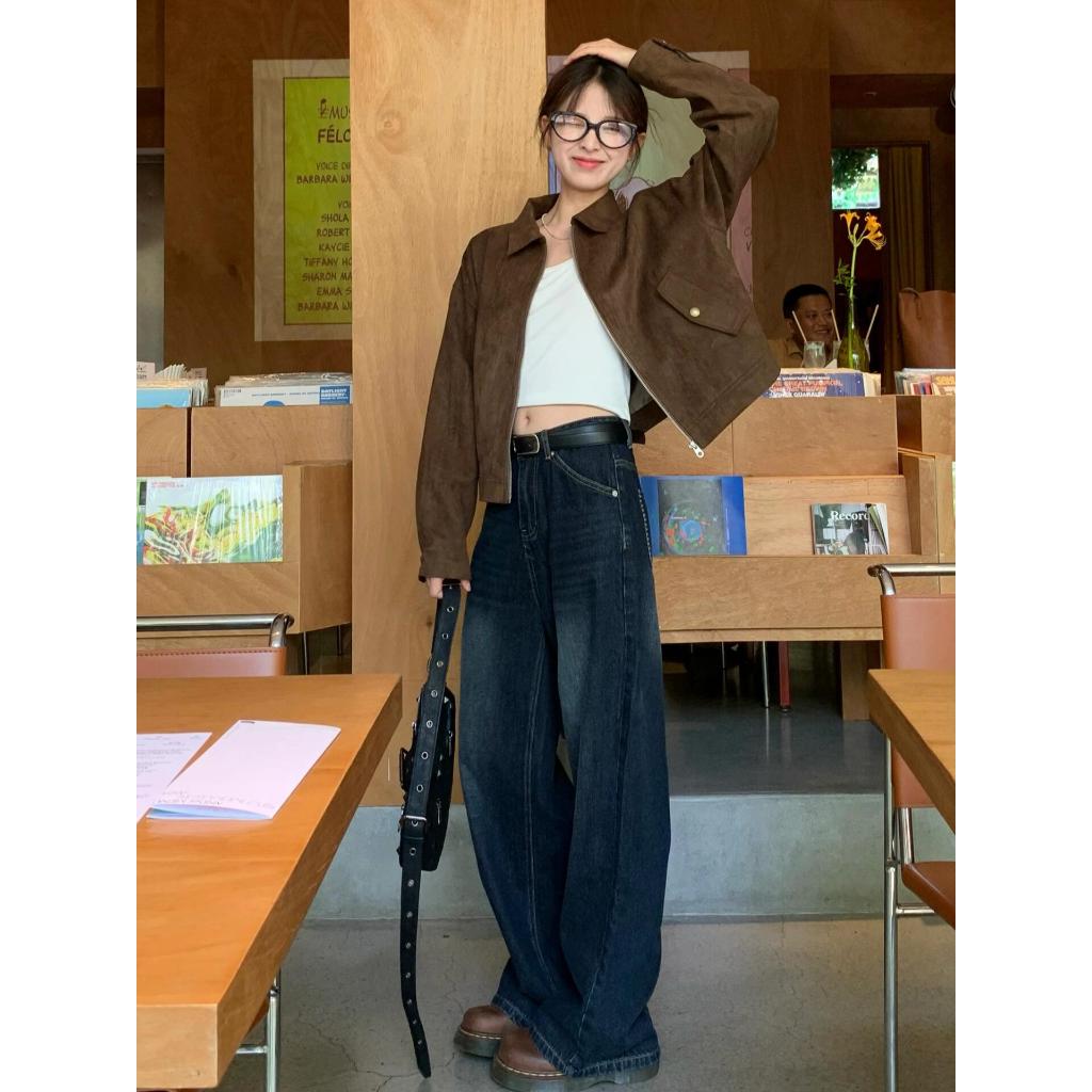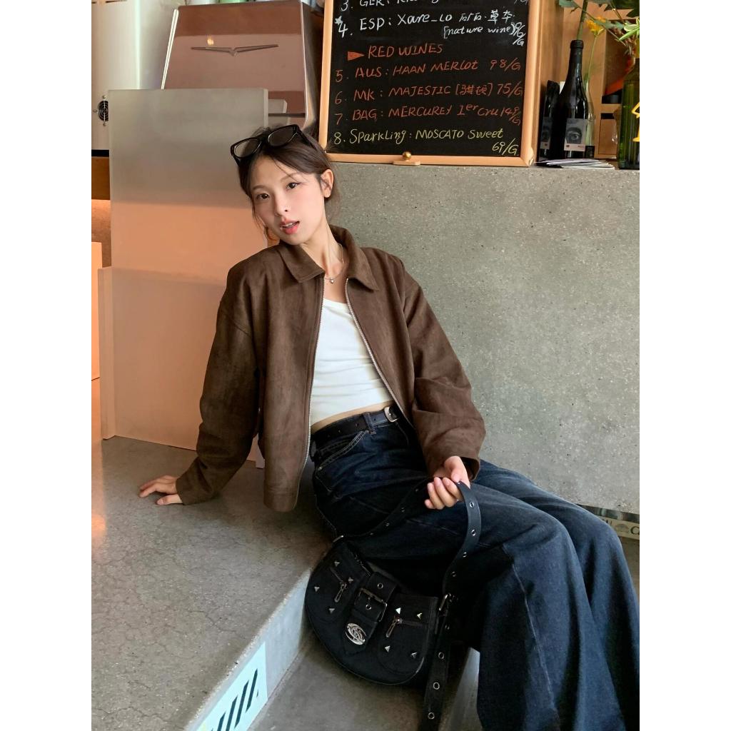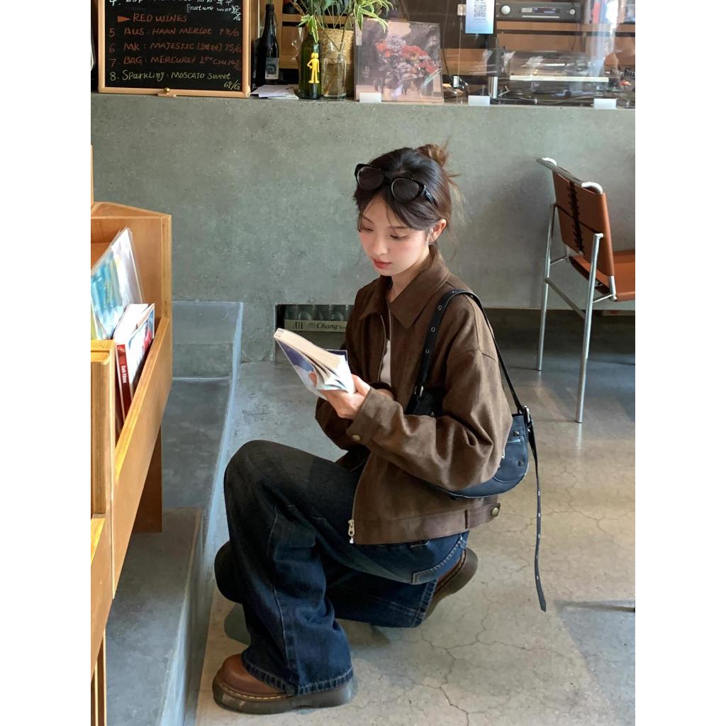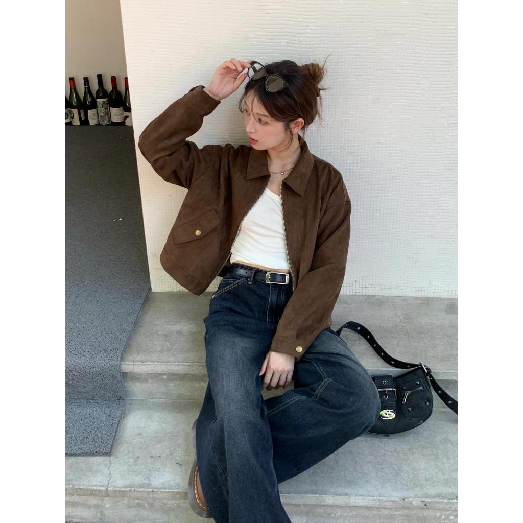 โค้ทสั้นสีกาแฟเย็นสำหรับผู้หญิง สไตล์เรโทร สวมได้ทั้งฤดูใบไม้ร่วงและใบไม้ผลิ
