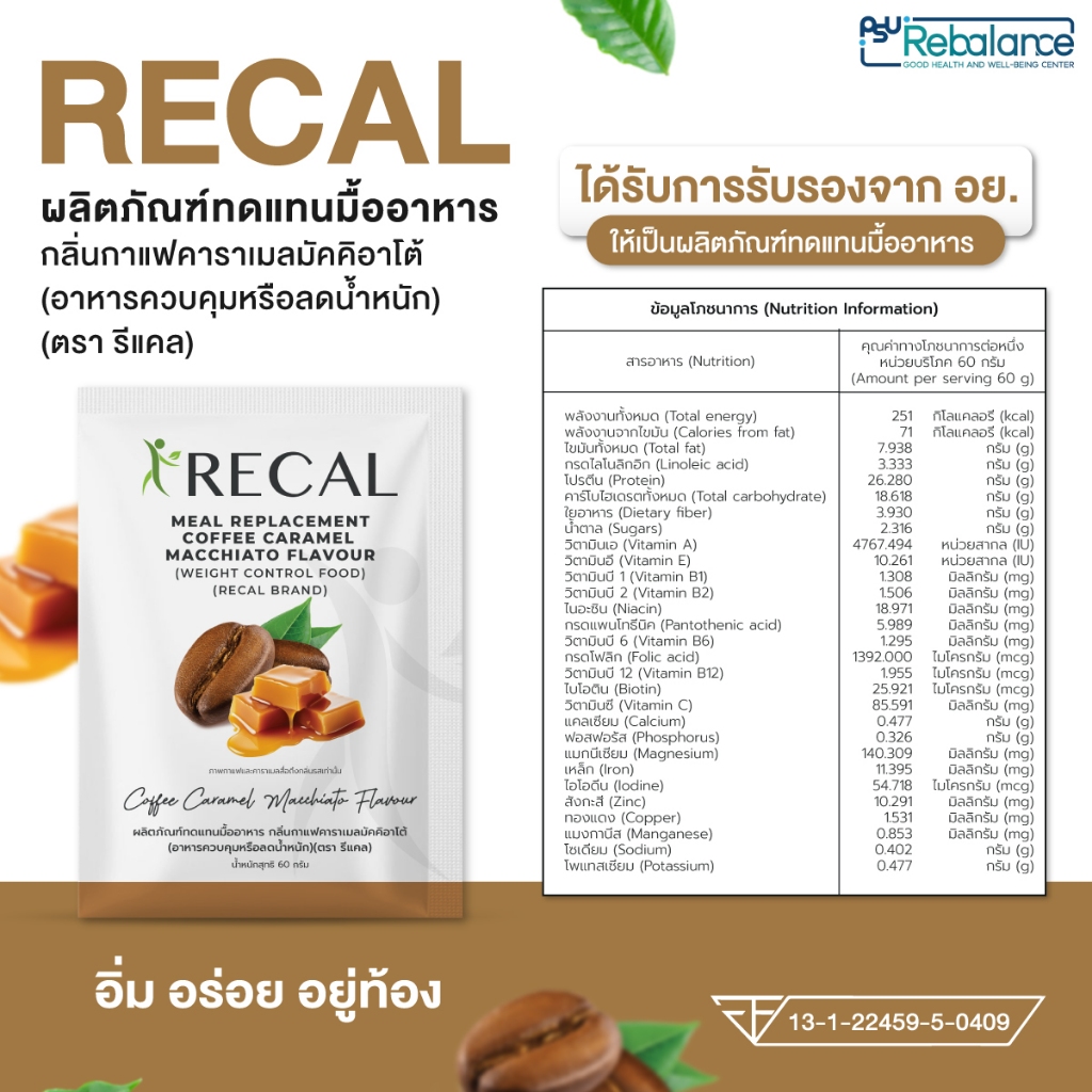 Recal Coffee Caramel Macchiato Flavour ผลิตภัณฑ์ทดแทนมื้ออาหาร กลิ่นกาแฟคาราเมลมัคคิอาโต้ อาหารควบคุมหรือลดน้ำหนัก
