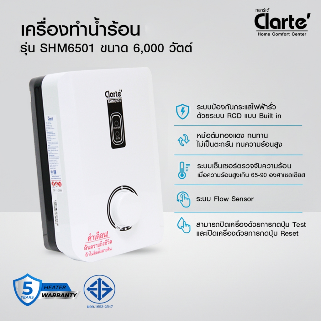 [สินค้าใหม่ส่งไวภายใน4 ชม.]Clarte'เครื่องทำน้ำร้อน 6000 วัตต์รุ่นSHM6501