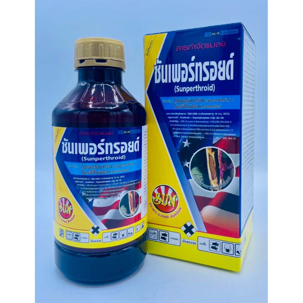 ไซเปอร์+โฟรฟีโนฟอส(สูตรเย็น)(ซันเพอร์ทรอยด์) กำจัดแมลง ดูดซึมและน๊อคฆ่า คุมไข่ กำจัดหนอนใบขาว หนอนกอ ตัวบิน บรรจุ1ลิตร/ข