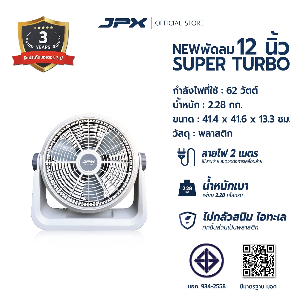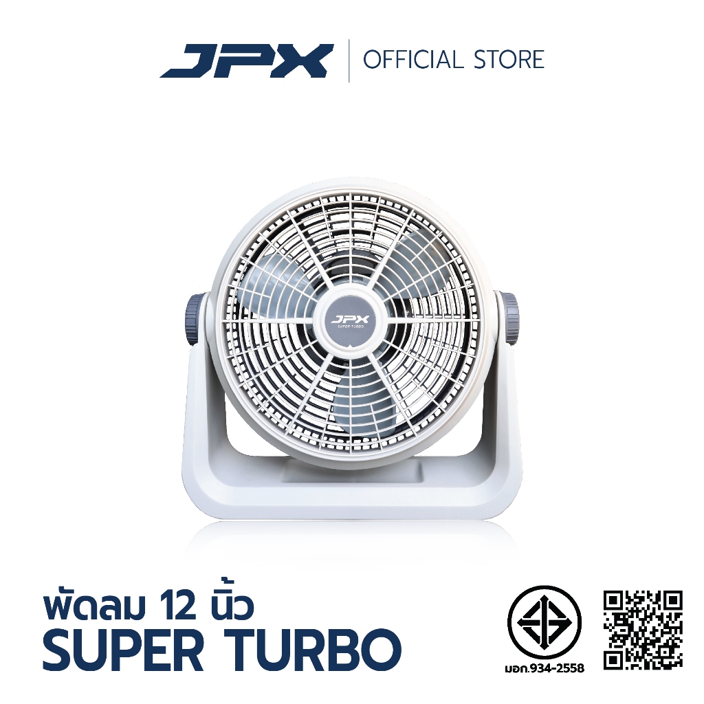 พัดลมแคมป์ปิ้ง พัดลมตั้งโต๊ะ12นิ้ว JPX สีขาว-เทา ปรับความแรงได้ 3 ระดับ SUPER TURBO รับประกันสินค้า 3 ปี