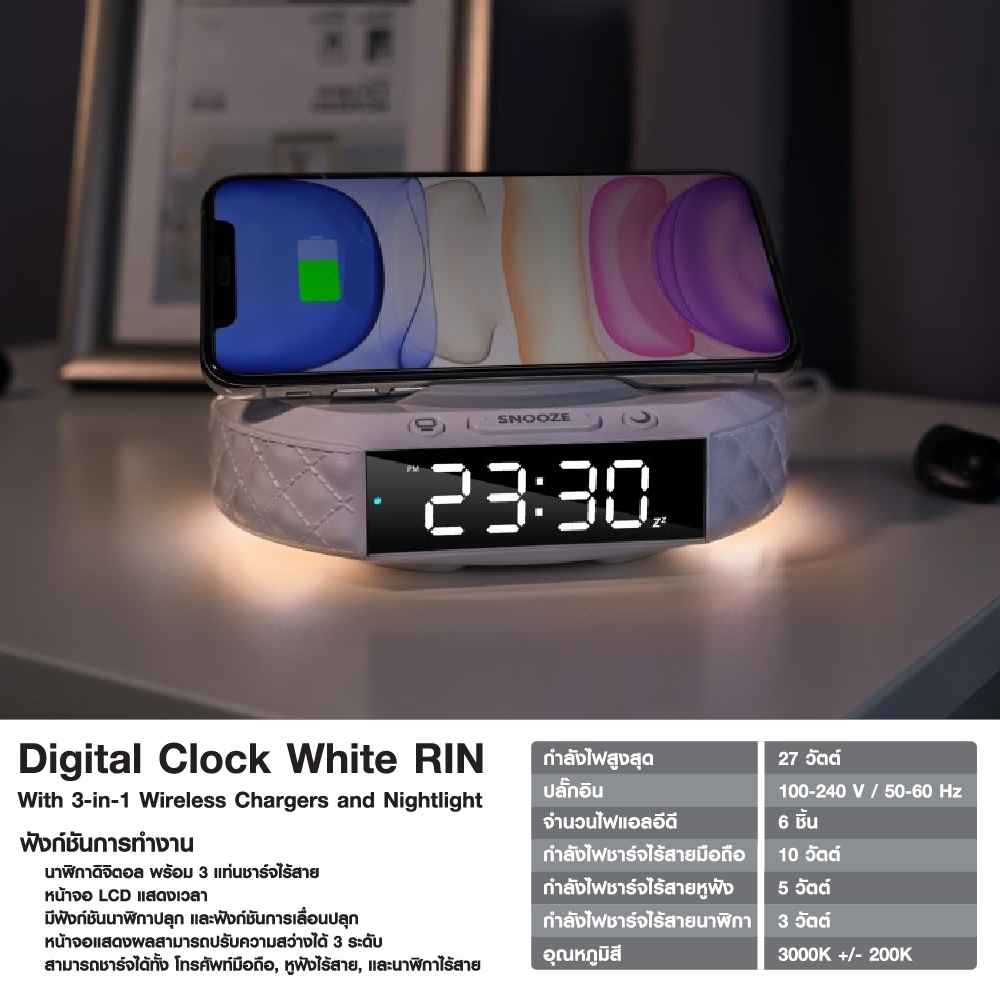 RIN Digital Clock 3-in-1 แท่นชาร์จไร้สาย มาพร้อมโคมไฟและนาฬิกาปลุก