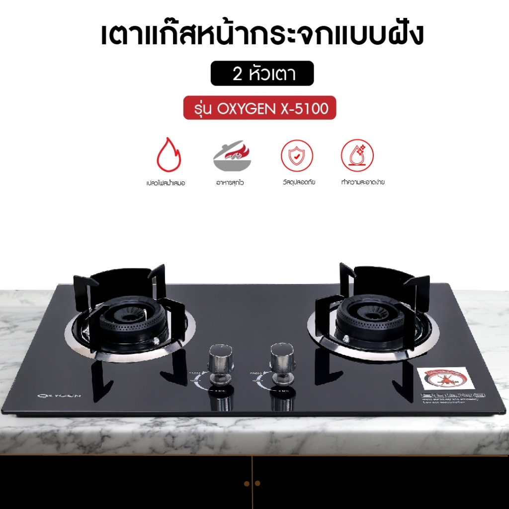 OXYGEN เตาแก๊ส แบบฝัง หรือวางพื้นโต๊ะ หัวคู่หน้ากระจก (หัวฟู่) รุ่น X-5100 เตาฝัง เตาแก๊สหน้ากระจก