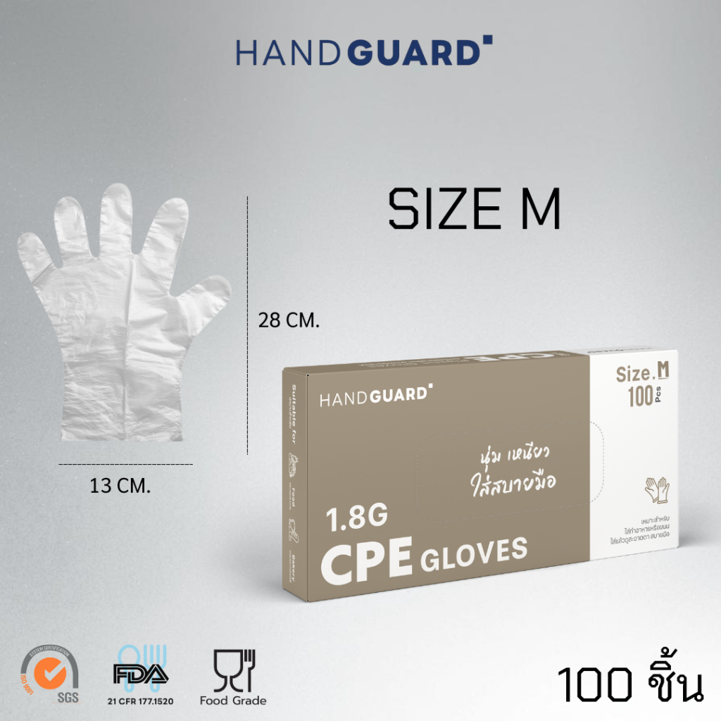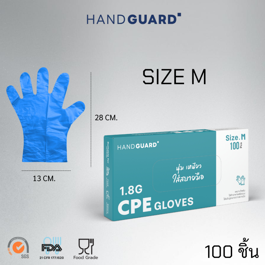 ถุงมือพลาสติก Hand Guard ชนิด CPE สีใส และ สีน้ำเงิน นุ่มเหนียว ใส่สบายมือ (Food grade) 100 ชิ้น / กล่อง