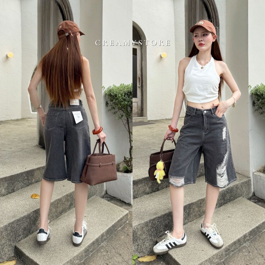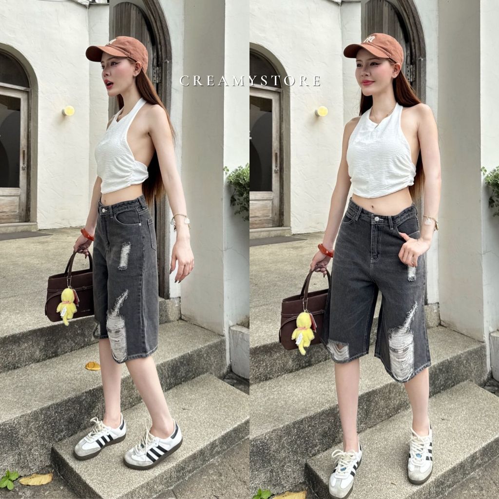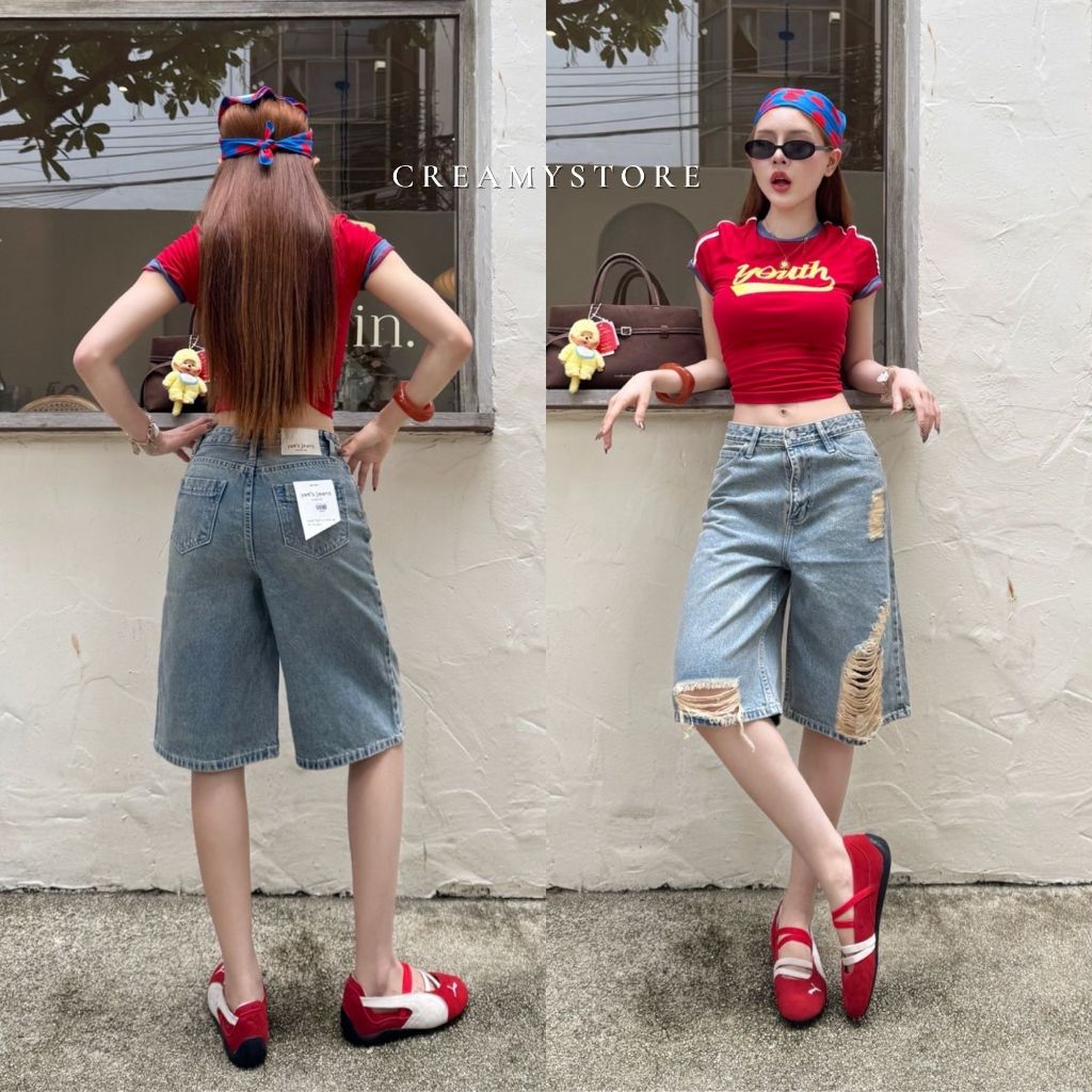 CreamyStore กางเกงยีนส์ขาสั้น 5ส่วน แต่งขาด ไซส์S-3XL ผ้าไม่ยืด ป้ายYam Jeans