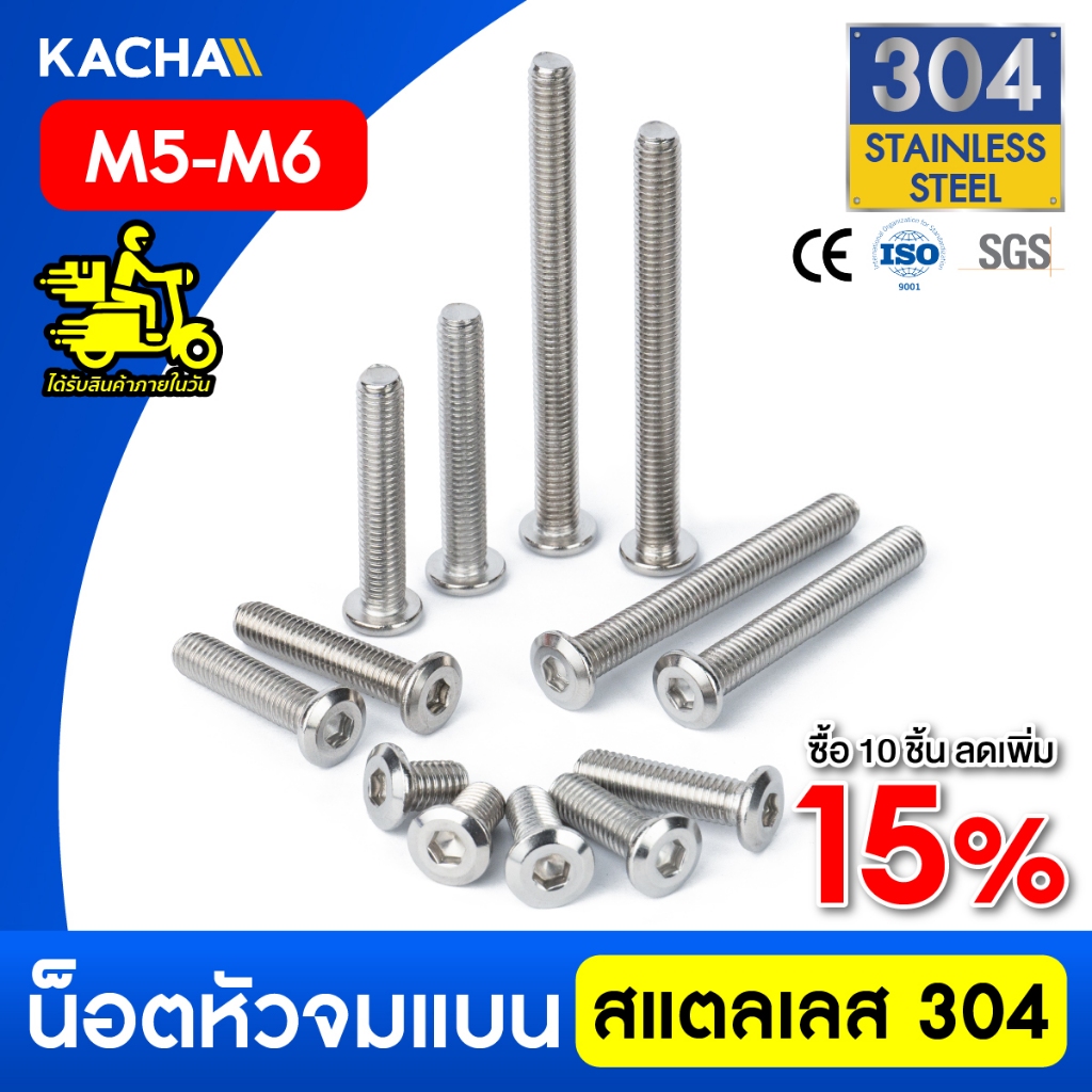 KACHA น็อตสกรูหัวจมแบน สแตนเลส 304 เกลียวมิล M5-M6 Round Flat Hex Socket Machine Screw SUS304