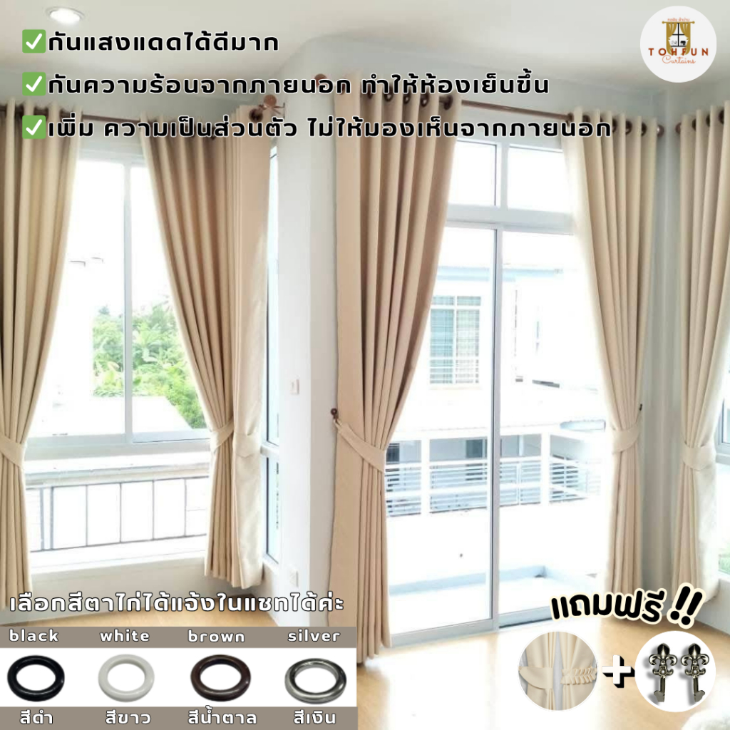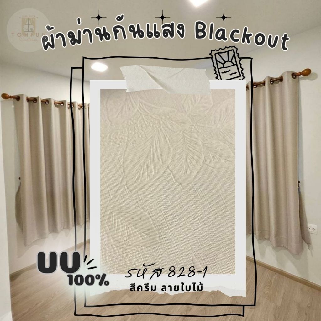ผ้าม่านตาไก่ สีครีมลายใบไม้ กั้นห้อง กั้นแอร์ได้ Blackout ม่านประตู,หน้าต่าง ม่านบังแสงแดด ผ้าม่านสีพื้น