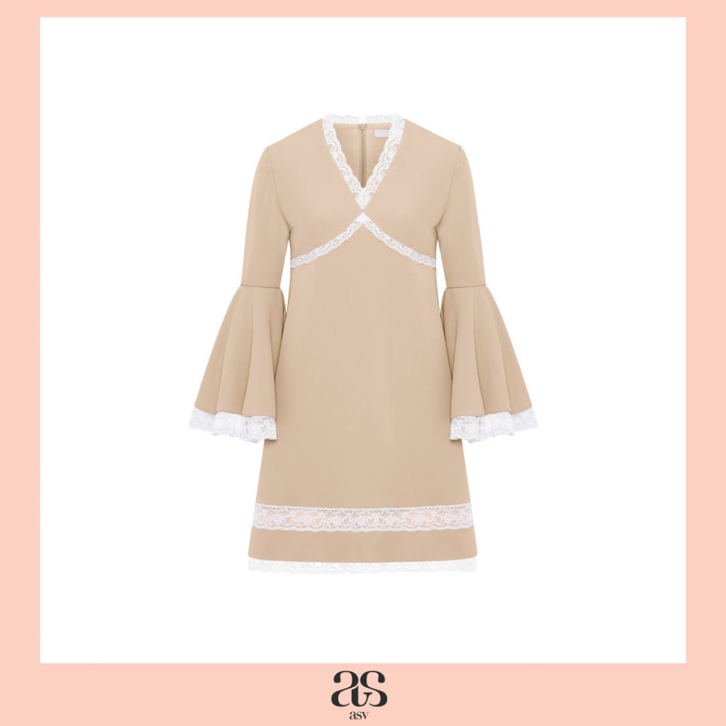[asv aw25] Laura Mini Dress เดรสผู้หญิงทรงเอ คอวี แขนยาว ปลายแขนแต่งลูกไม้ แต่งแถบลูกไม้ กระโปรงตัดต่อผ้าลูกไม้ ซิปหลัง
