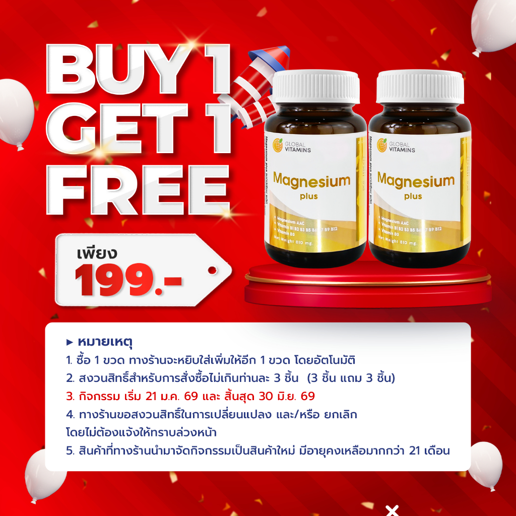 [ซื้อ 1 แถม 1] แมกนีเซียม พลัส โกลบอลวิตามิน Magnesium plus Global Vitamins วิตามินบี Vitamin B