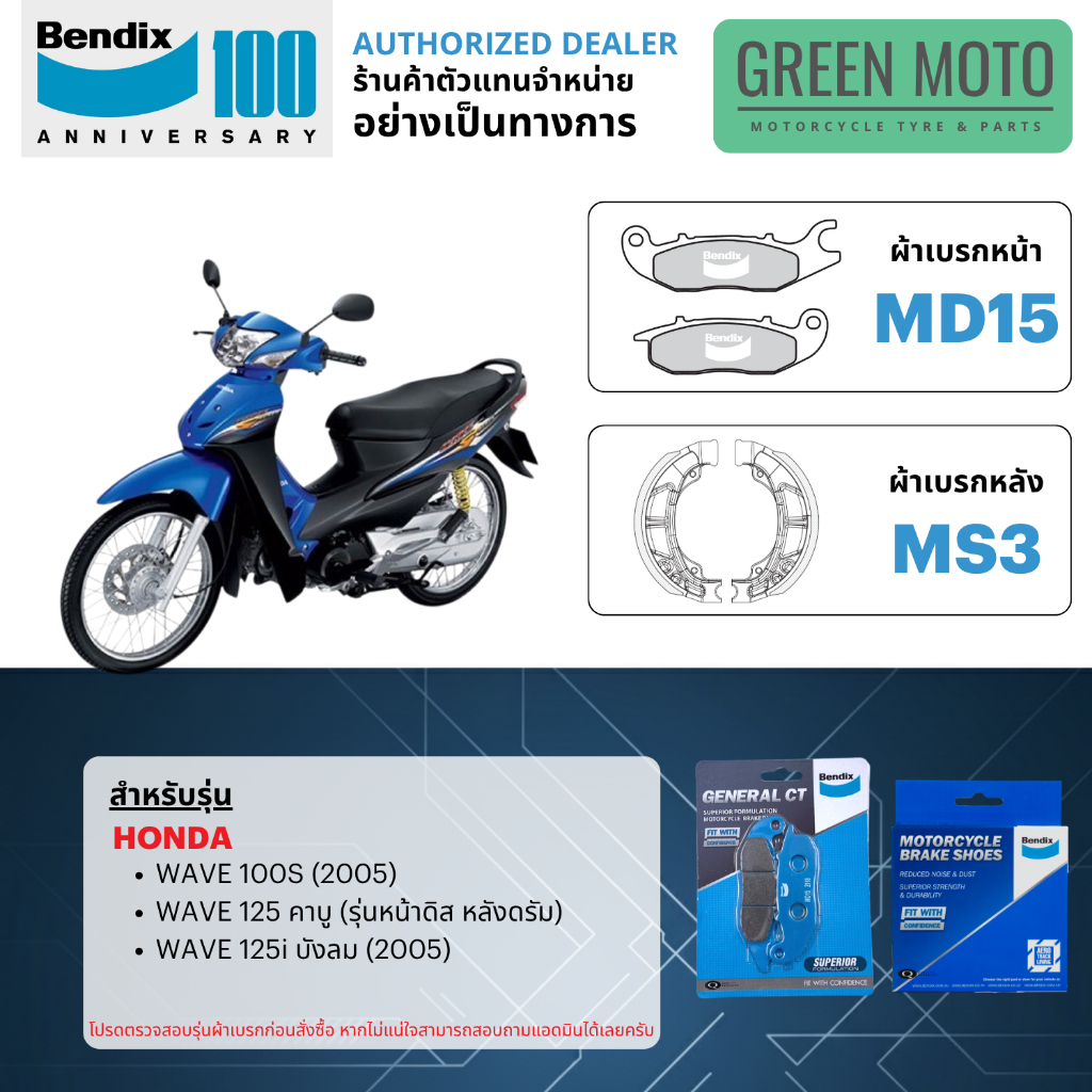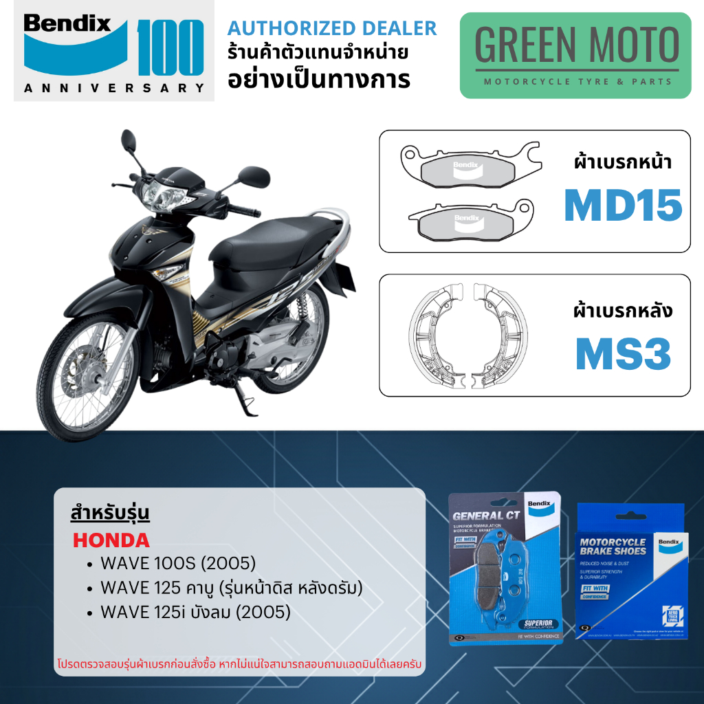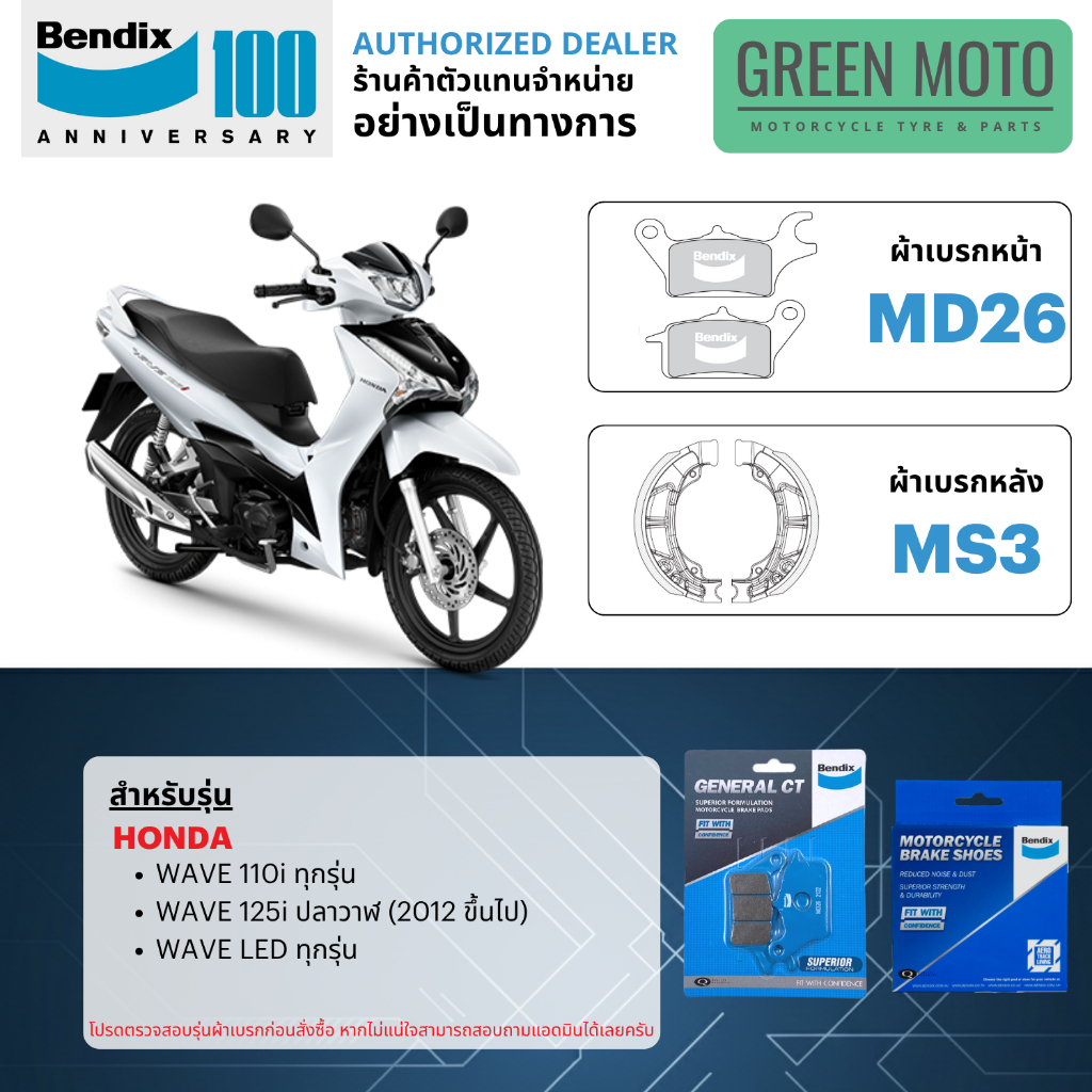 ผ้าเบรค BENDIX จัดชุดสำหรับ WAVE ทุกรุ่น 100 / 110 / 110i / 125 / 125i เบรคหน้า-หลัง รหัส MD1, MS3, MD15, MD26 ของแท้