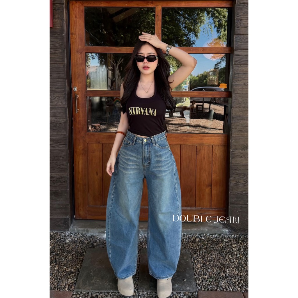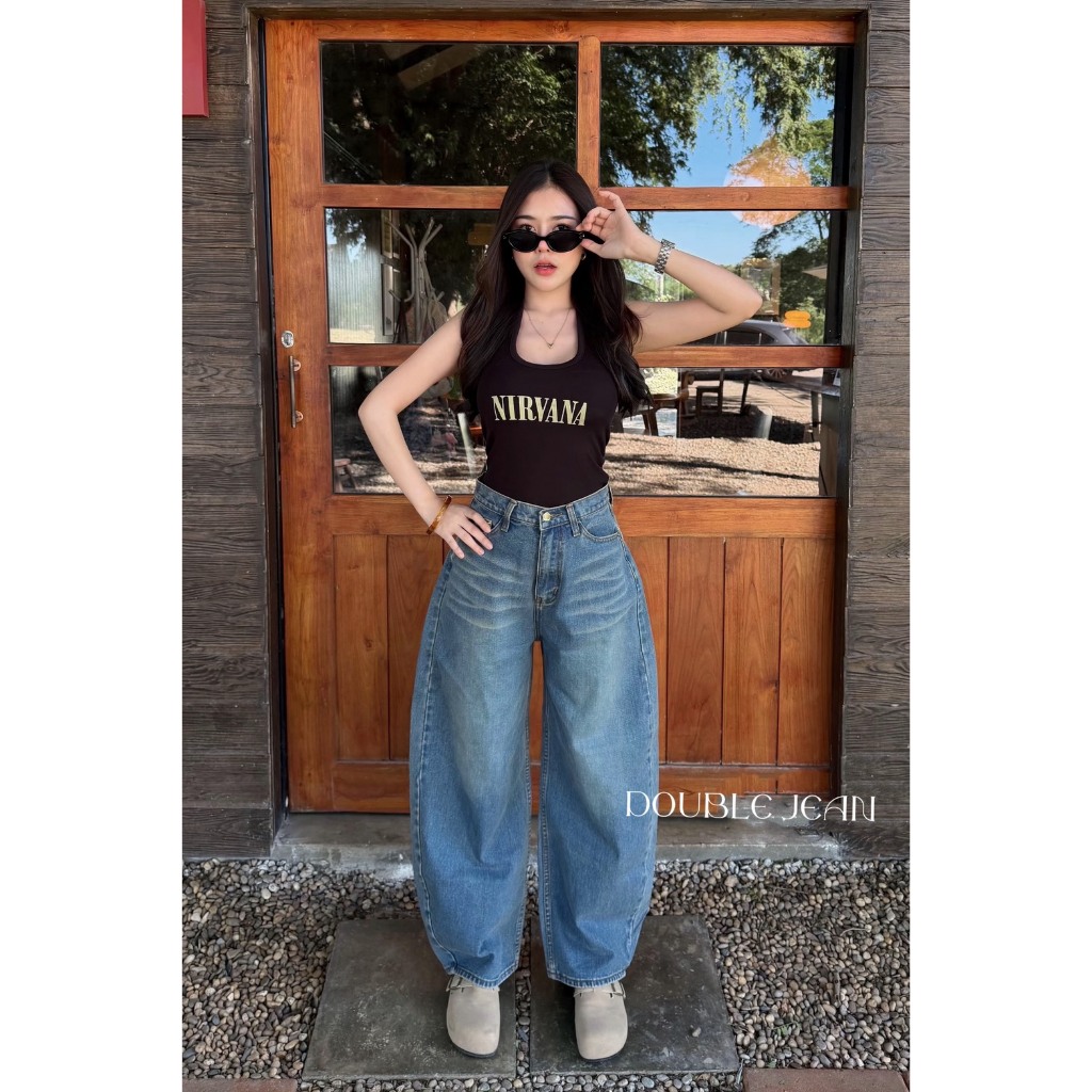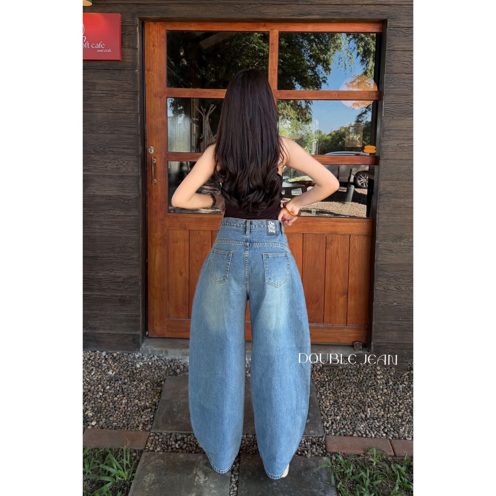 DBJ กางเกงยีนส์ทรงบาเรลแซมโค้งสีสนิมอ่อน ป้าย ON THE WAY แต่งหนวดด้านหน้า ทรงโค้ง [S-XL]