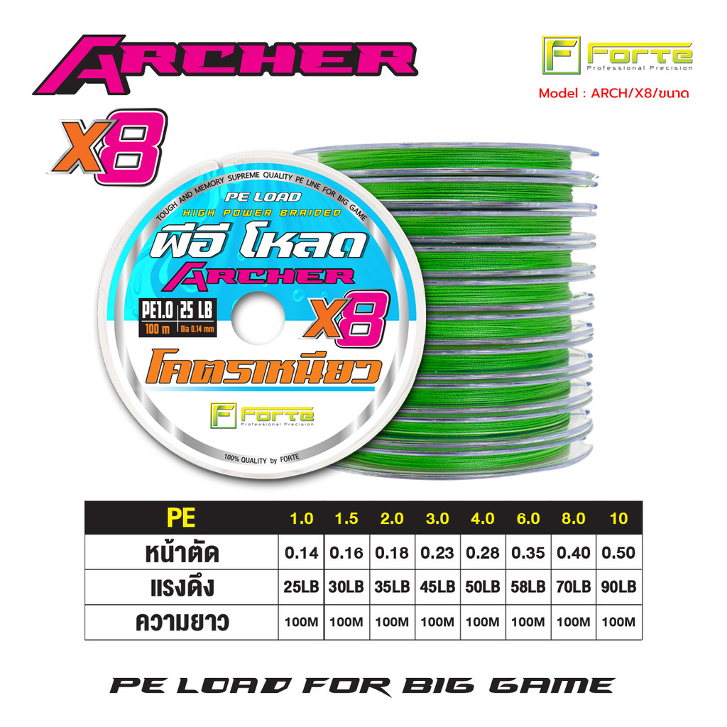 สายพีอี ถัก8 ARCHER สายถัก 8 เส้นมีความเหนียวแน่น สามารถรับแรงกระชากได้สูง เหมาะสำหรับการตกปลาทั่วไป