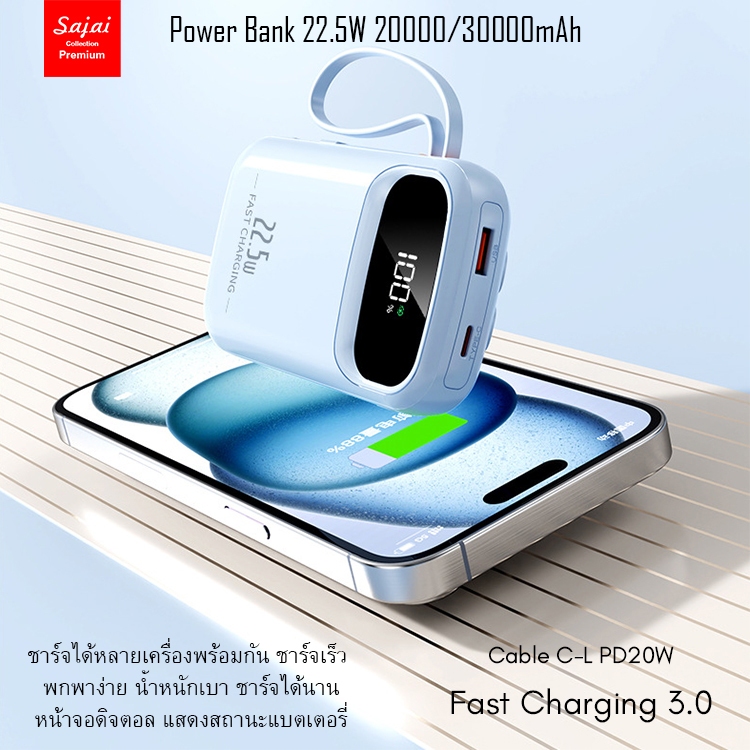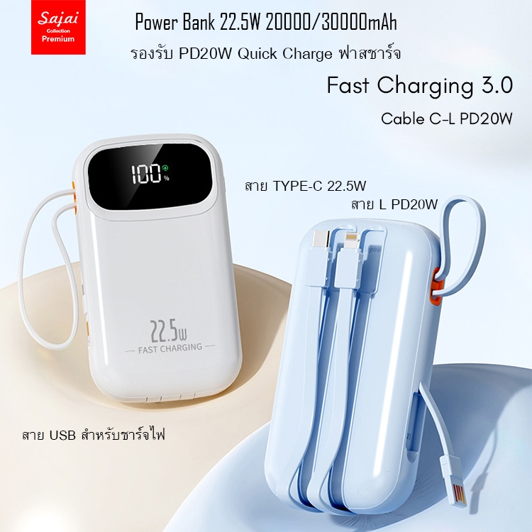 SAJAI Powerbank S30Pro-3 PD22.5W 2/30000mAh มีสายชาร์จในตัว3สาย PD20W/QC3.0 พาวเวอร์แบงค์ แบตสำรอง