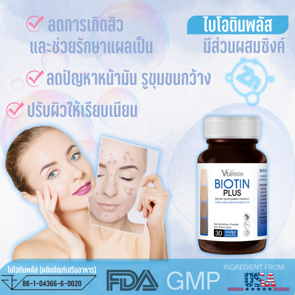 {หยุดผมร่วง,เร่งผมยาว} BIOTIN PLUSไบโอตินพลัสผสมซิงค์และซีบัคธอร์น30แคปซูล