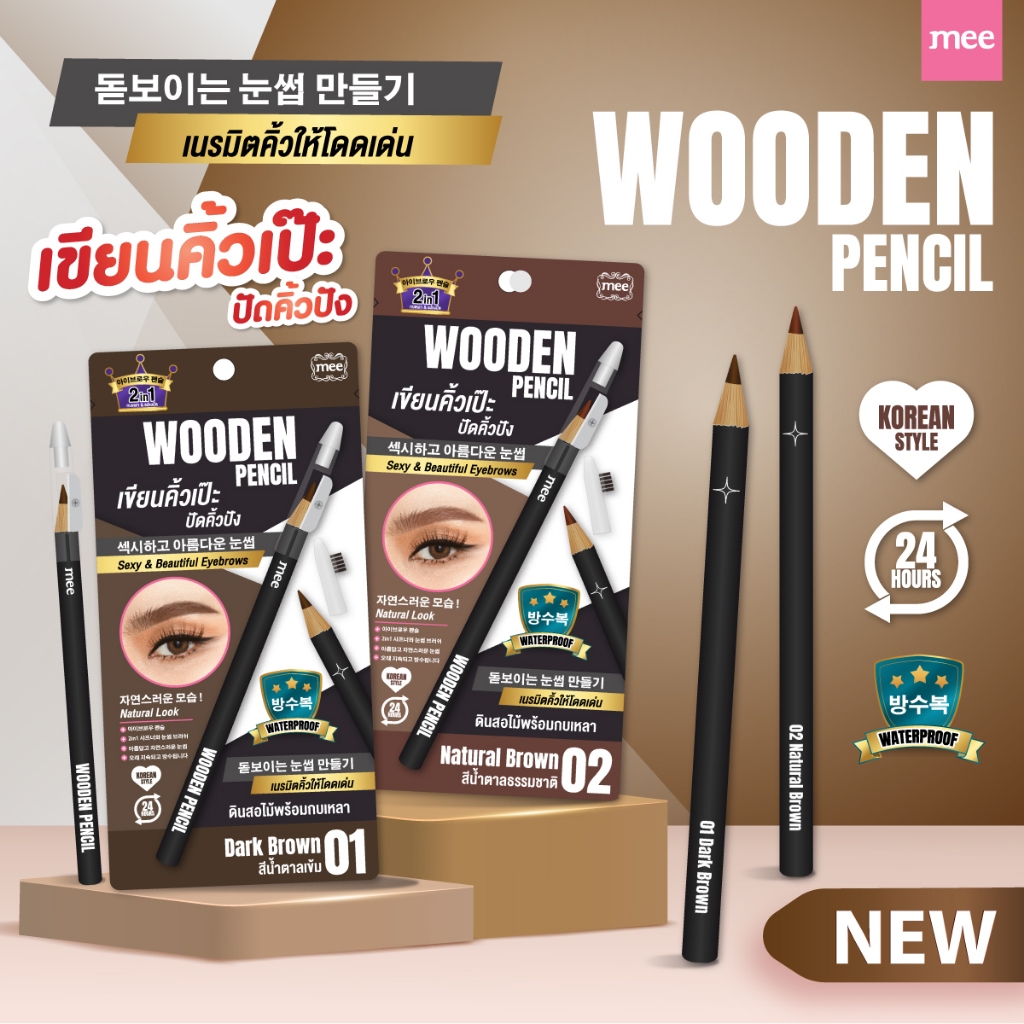 +(ขายดีมาก) MEE WOODEN PENCIL ดินสอเขียนคิ้วแบบแท่งไม้ เนื้อนุ่มเขียนง่าย มีกบเหลาและแปรงปัดคิ้ว