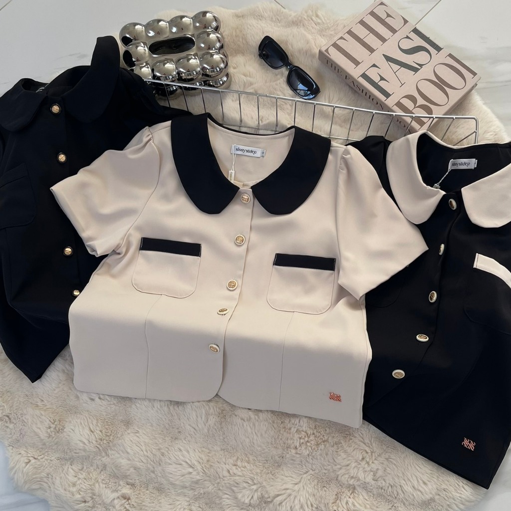 SISSY : เสื้อแขนสั้นคอบัว ปกทูโทน (S–XXL) ปักอะไหล่โลโก้ ผ้านุ่มลื่นใส่สบาย ดีไซน์เรียบหรู