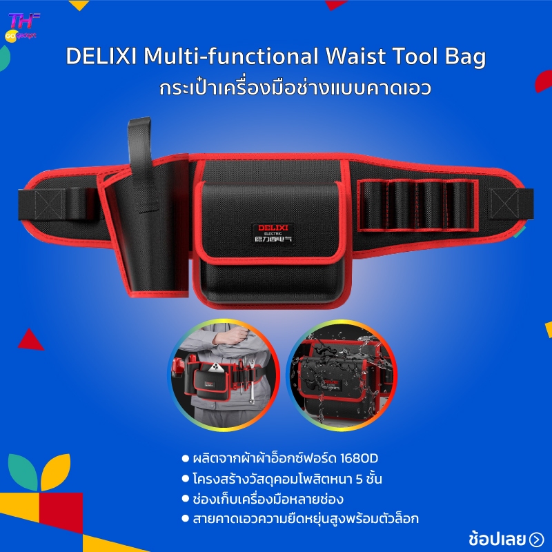 DELIXI Multi-functional Waist Tool Bag กระเป๋าเครื่องมือช่างแบบคาดเอว ผลิตจากผ้าผ้าอ็อกซ์ฟอร์ด กันน้ำ ป้องกันรอยขีดข่วน