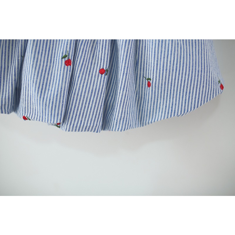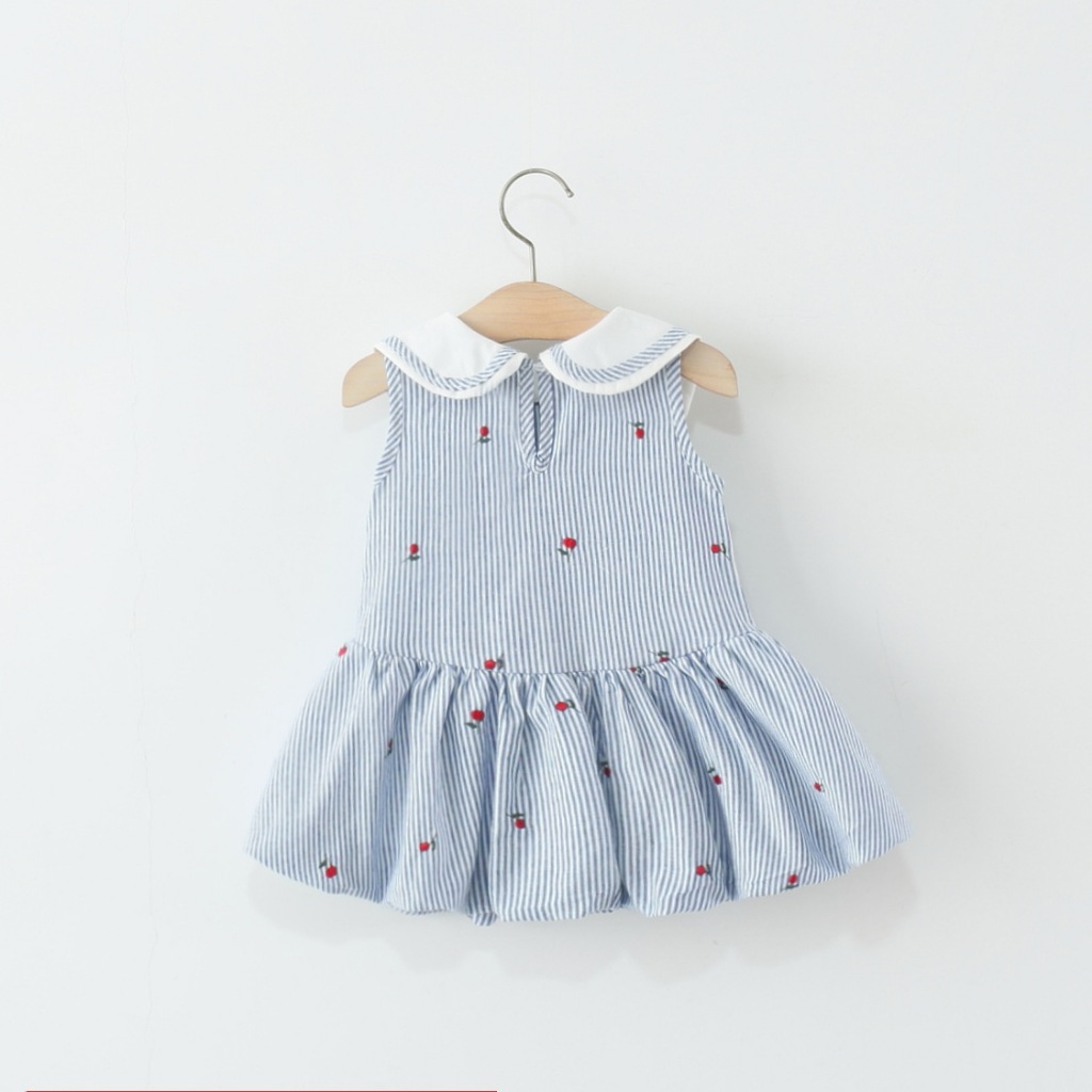 ฤดูร้อนชุดเด็กผู้หญิงใหม่ที่มีเย็บปักถักร้อยสตรอเบอร์รี่และเด็กแนวตั้งลายแขนกุดปกกระโปรงลําลองเหมาะสําหรับ 0-4 ปี