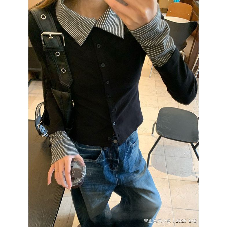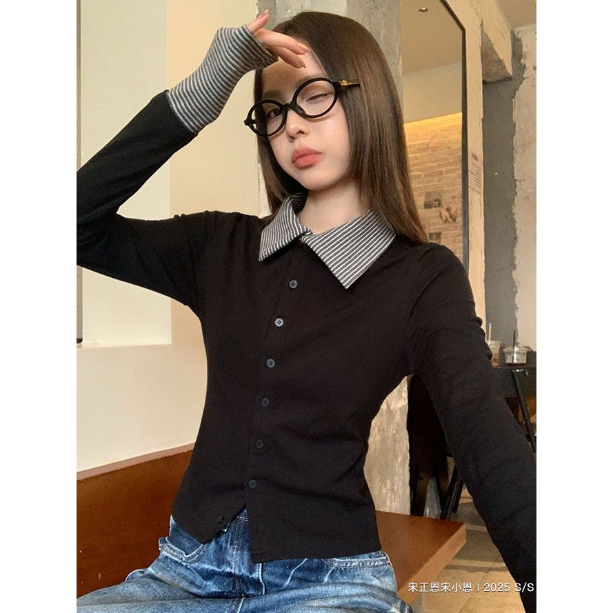 ลายเย็บคอปกโปโลปลอมสองชิ้นเสื้อยืดด้านใน จุดต่ําสุด เสื้อผู้หญิงฤดูใบไม้ร่วงออกแบบ บาง-พอดี สูงสุด