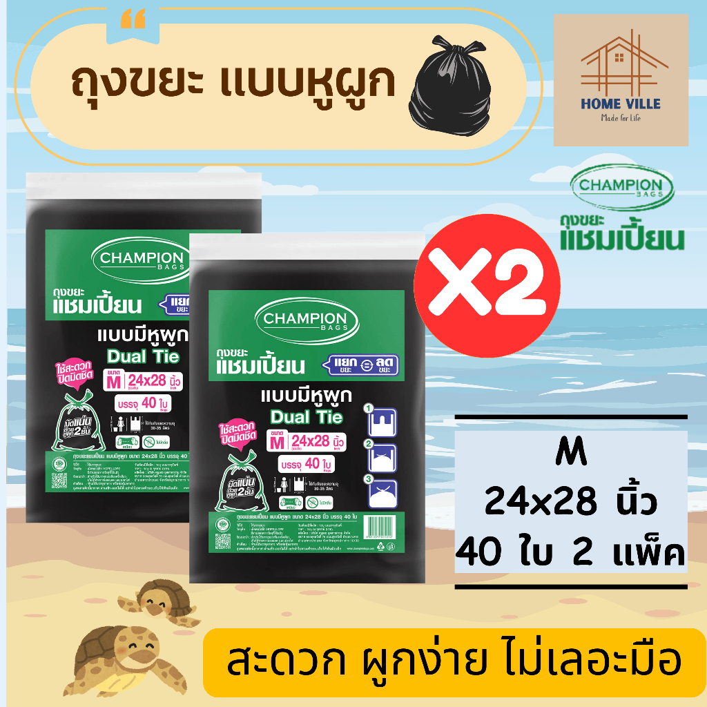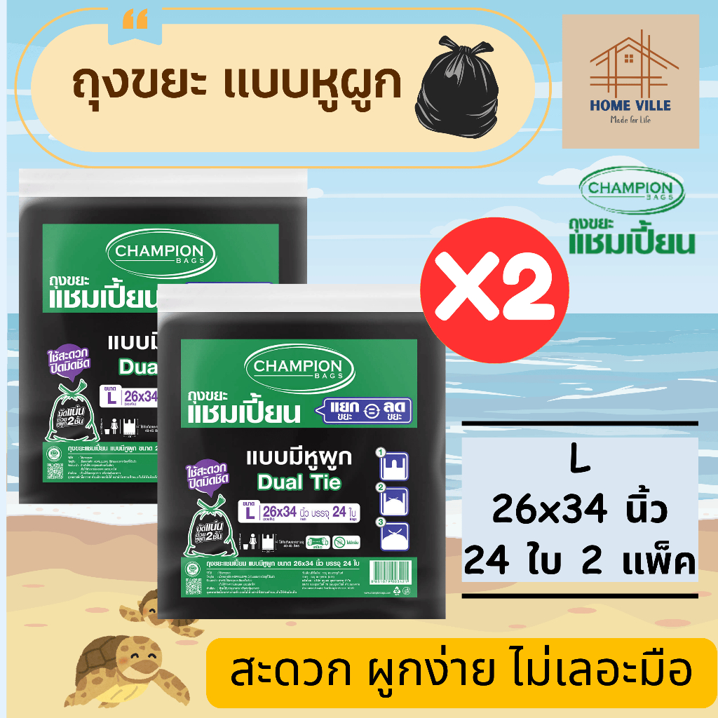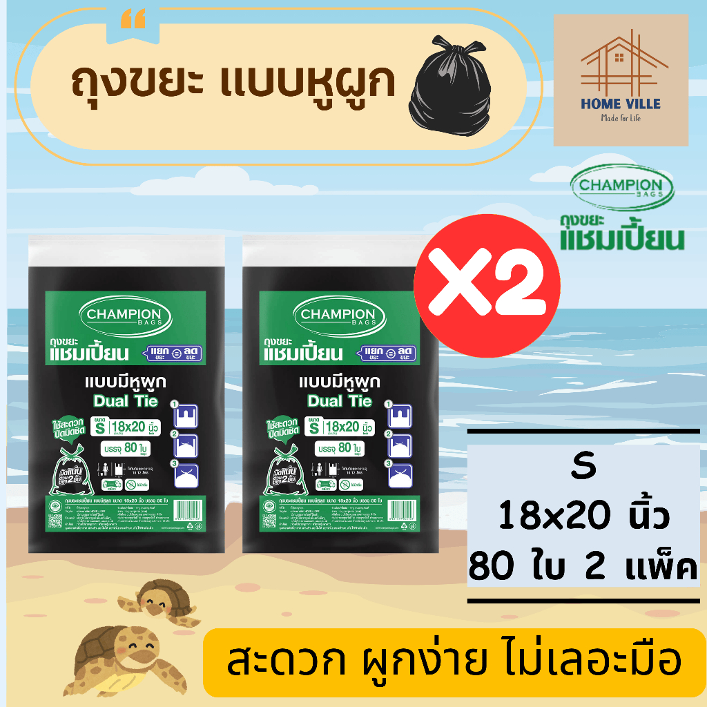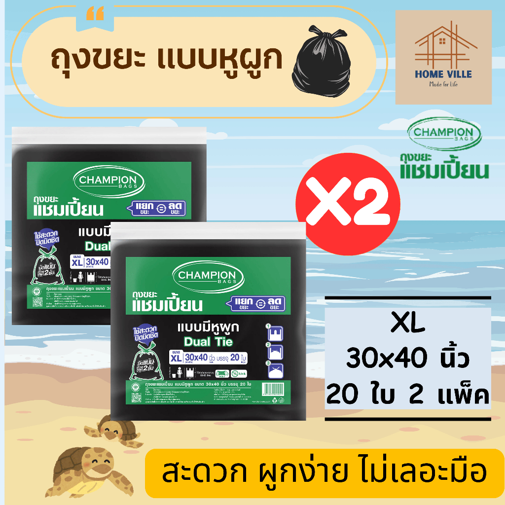 [2 แพ็ค] ถุงขยะ แบบหูผูก สีดำ หูผูก 2 ชั้น ปิดมิดชิด มี 5 ขนาด (Champion Bags)