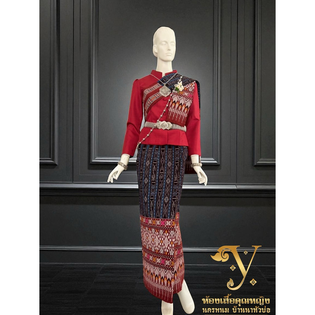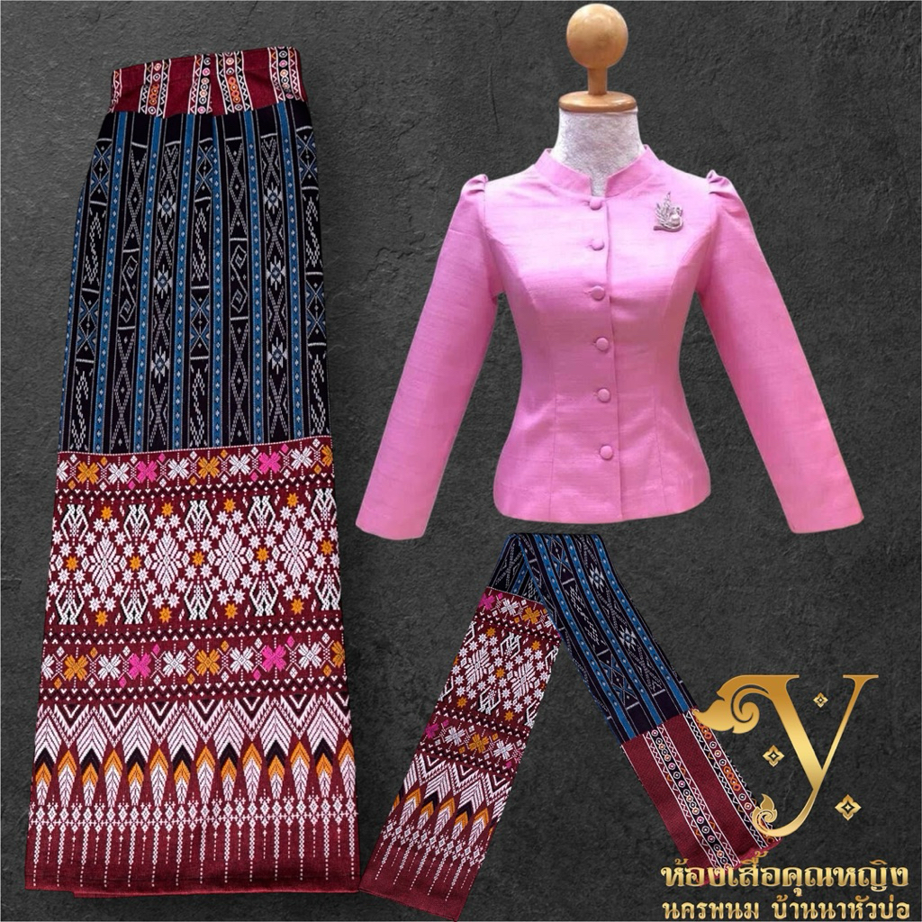 ชุดไทยจิตรลดาเสื้อไหมหม่อน+สใบ+ผ้าถุงพิมพ์ลายมัดหมี่ลายขอตัดฟรีไชร์ป้ายตะขอมีไชร์อก32ถึงอก50