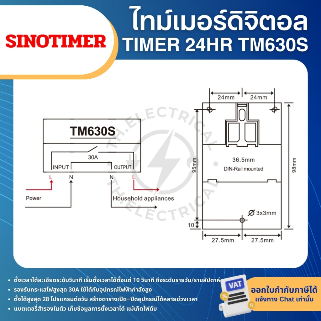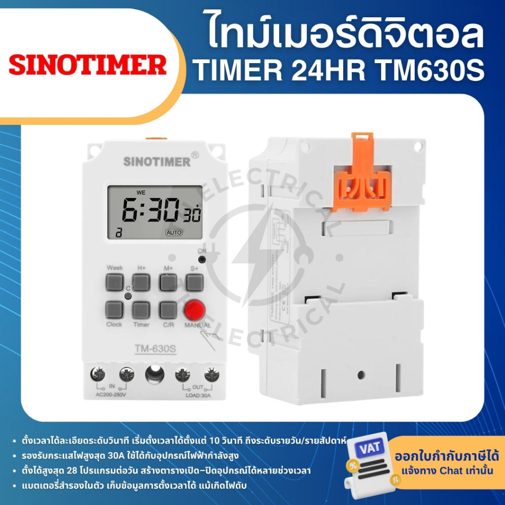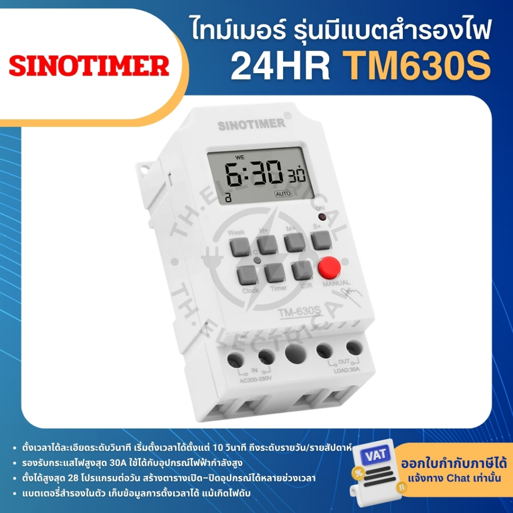 SINOTIMER TM630S ไทม์เมอร์ดิจิตอล 24HR รุ่นมีแบตสำรองไฟ 30A 220-230VAC TIMER 28 ON/OFF Programs