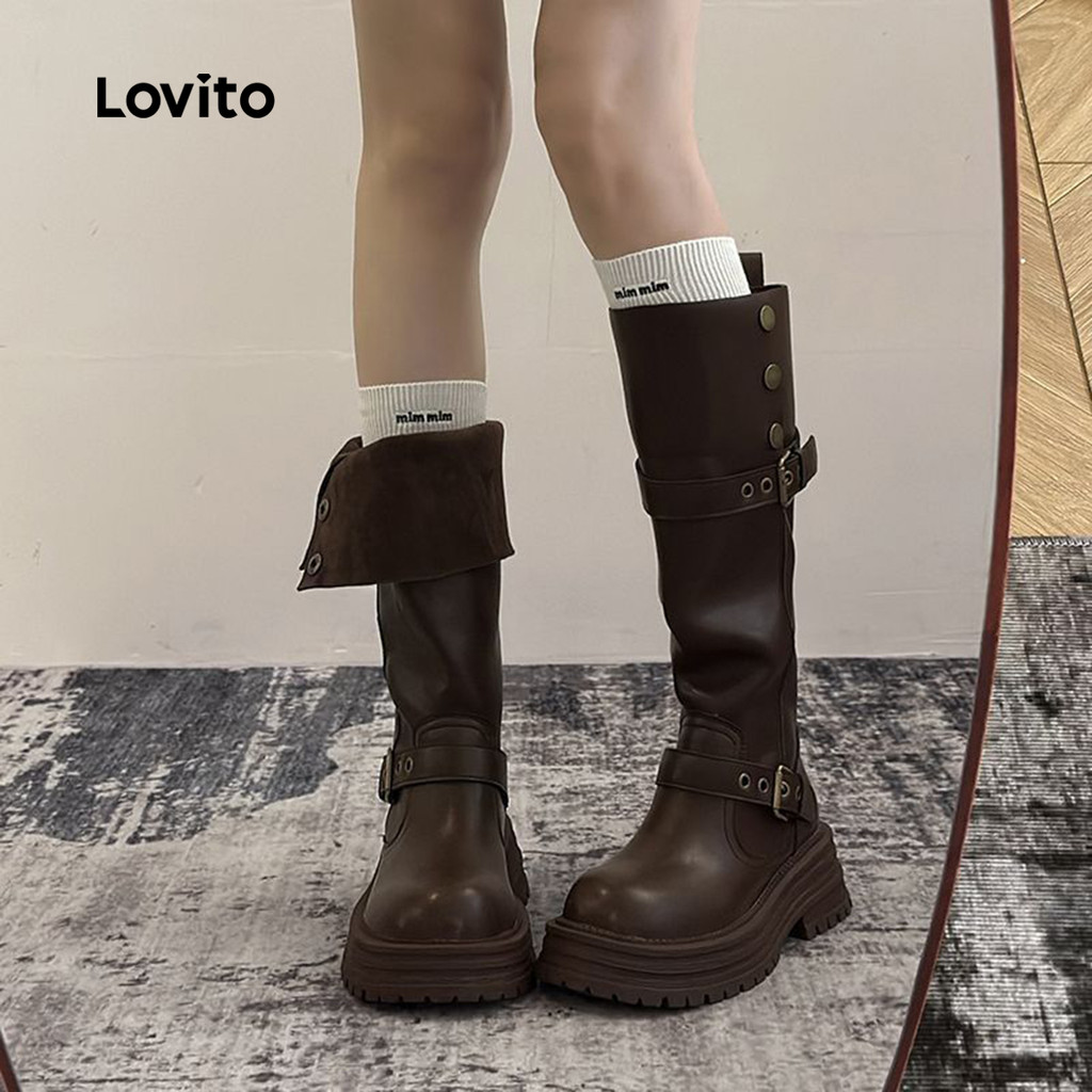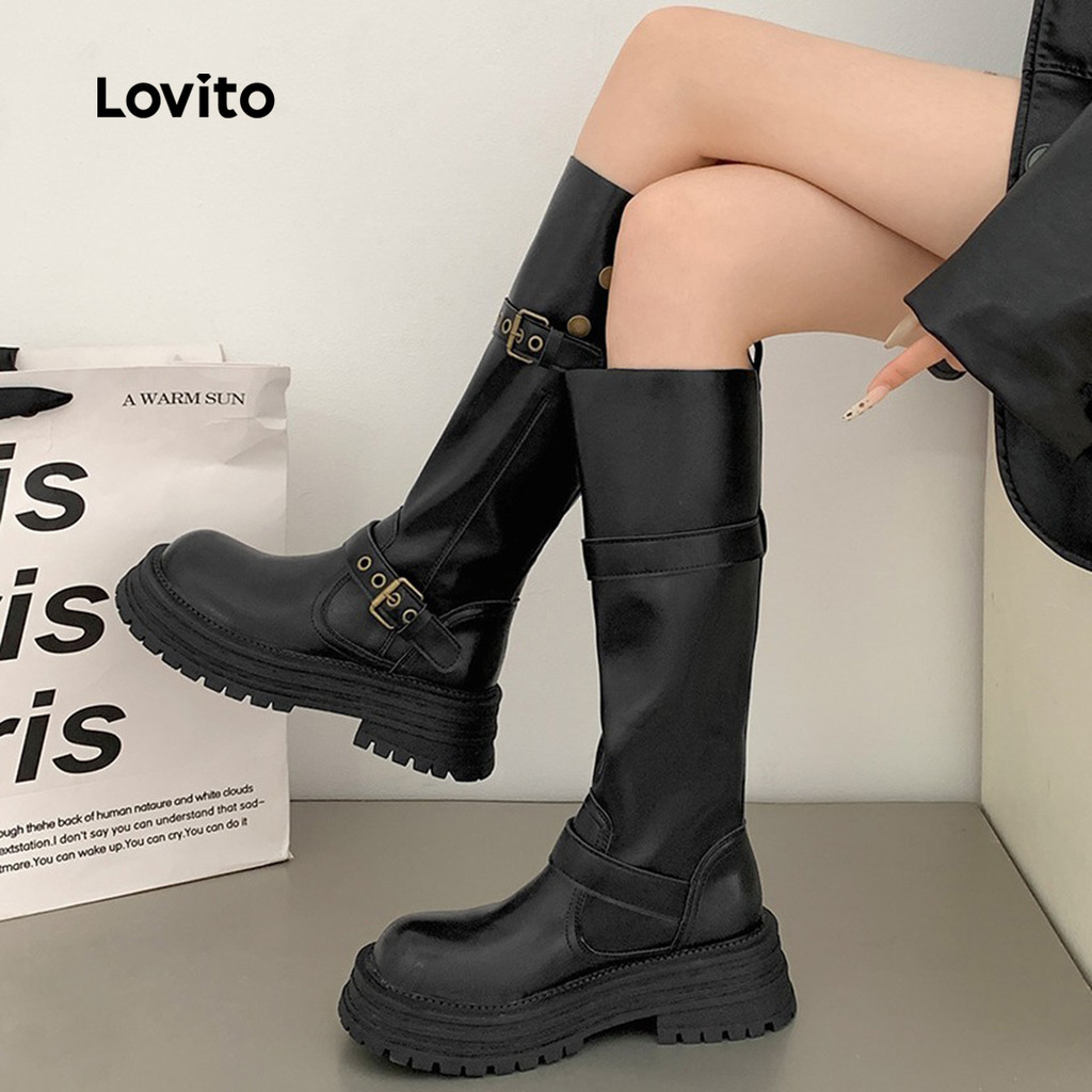 Lovito รองเท้าบูทแคชชวลแบบแพลตฟอร์ม สไตล์เรโทร ใช้ได้ทุกฤดู สีดำ สำหรับผู้หญิง LFA86075