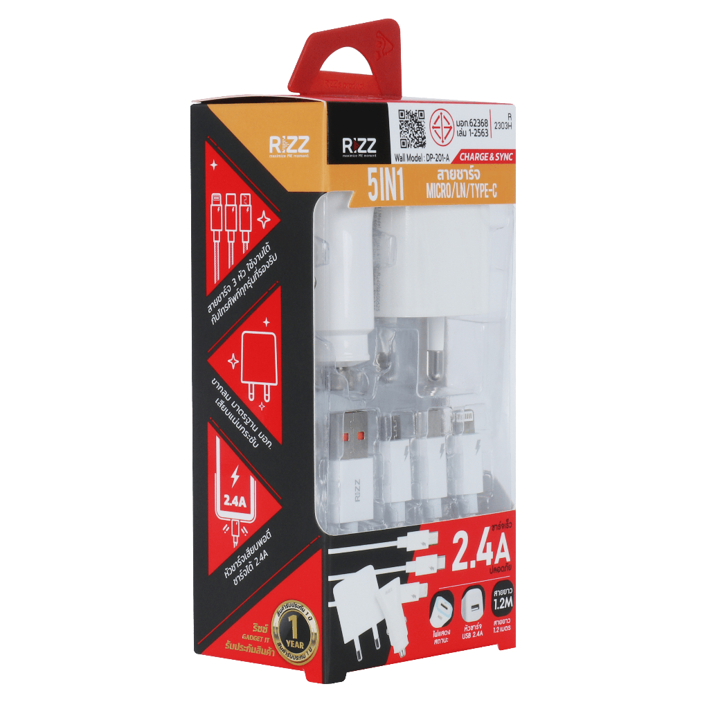 [Official] Rizz ชุดชาร์จริซซ์ 5 in1 ชาร์จเร็ว 2.4A สายชาร์จ 3 หัว Micro / Type-c / LN รุ่น R-2303H