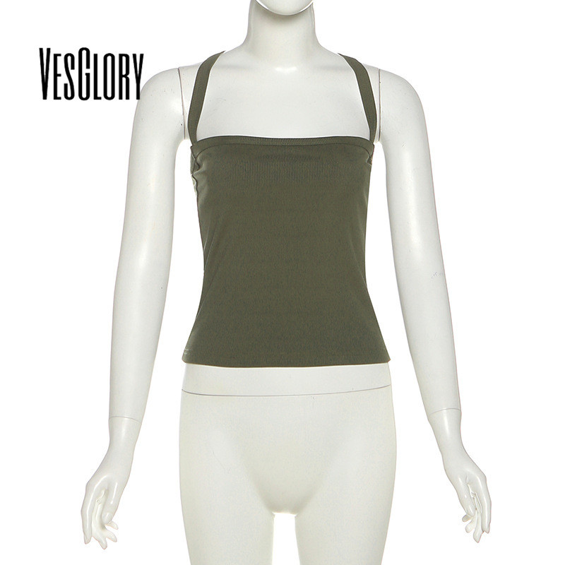 VesGlory ผู้หญิง 2025 แฟชั่น Tanks สายคล้องคอแขนกุดสีทึบ Casual Street สวมใส่สไตล์