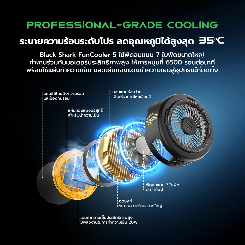 [ลดเหลือ 1192] Black Shark FunCooler 5 พัดลมระบายความร้อนมือถือ 20W 7 ใบพัด เย็นเร็ว 25 วินาที -1Y