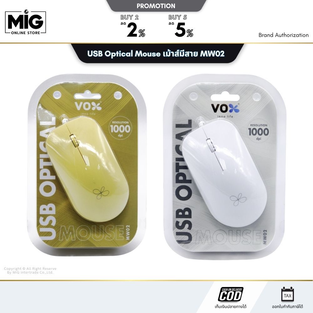 Vexxo USB Optical Mouse เมาส์ เมาส์มีสาย รุ่น MW02 ความยาวสาย 1.5 เมตร มี 4 สีให้เลือก ขาว ดำ เหลือง ม่วง