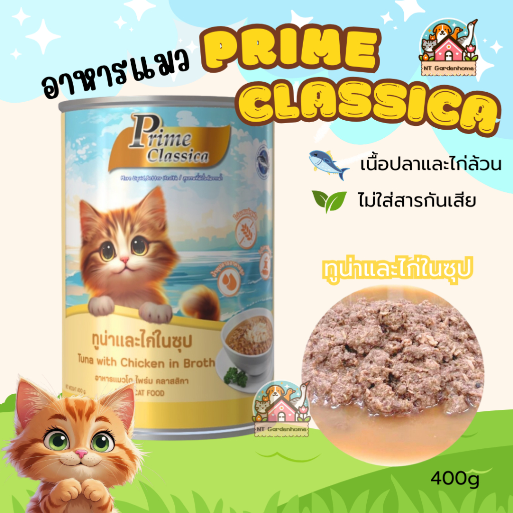 (6 กระป๋อง)Prime Classica ไพร์ม คลาสสิกา อาหารแมวเปียก พรีเมี่ยม ในน้ำซุป กระป๋องใหญ่ ขนาด 400g