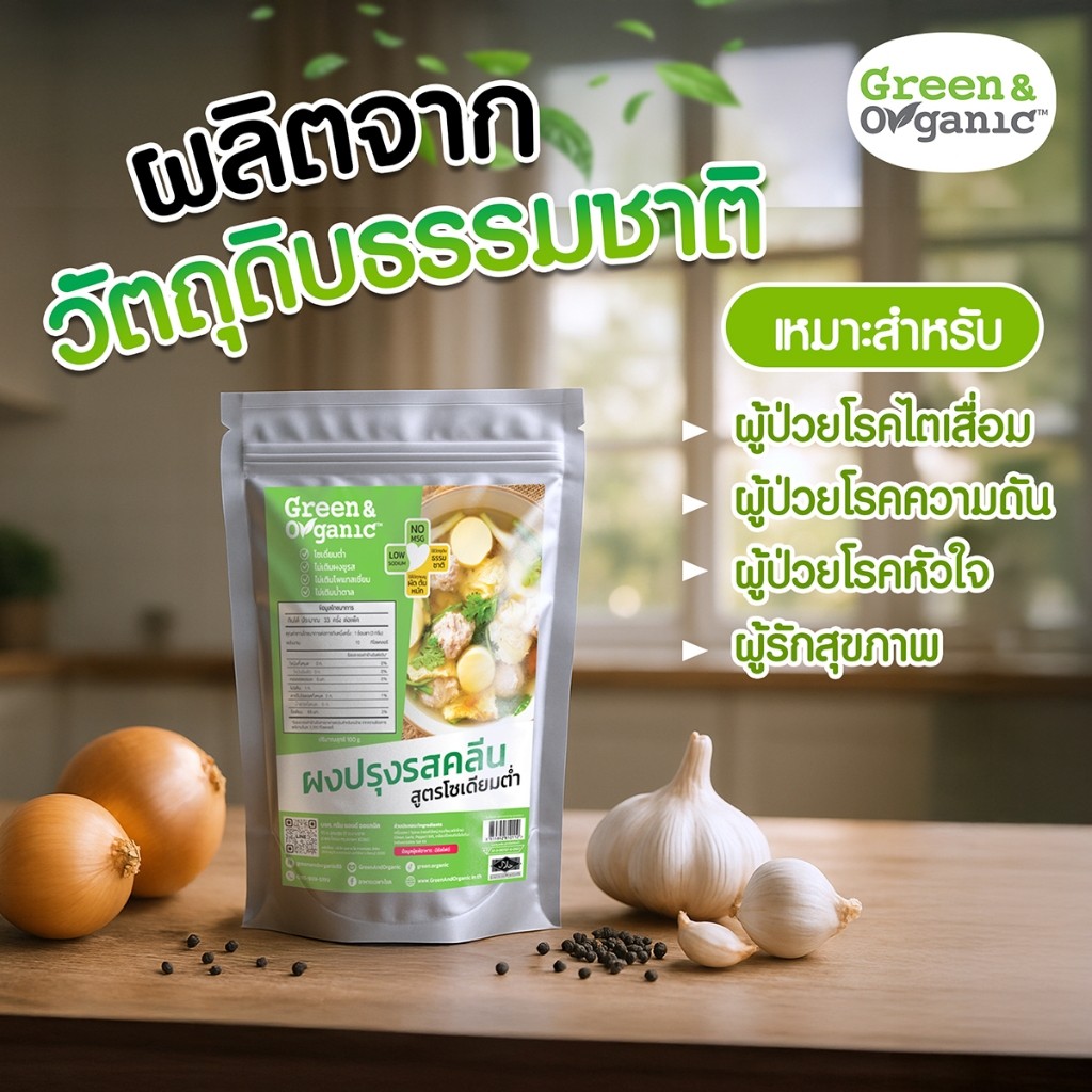 Green&Organic ผงปรุงรสคลีน สำหรับโรคไต ปรุงรสสุขภาพ โซเดียมต่ำ 91% ไม่เติมผงชูรส ไม่เติมน้ำตาล 100 กรัม