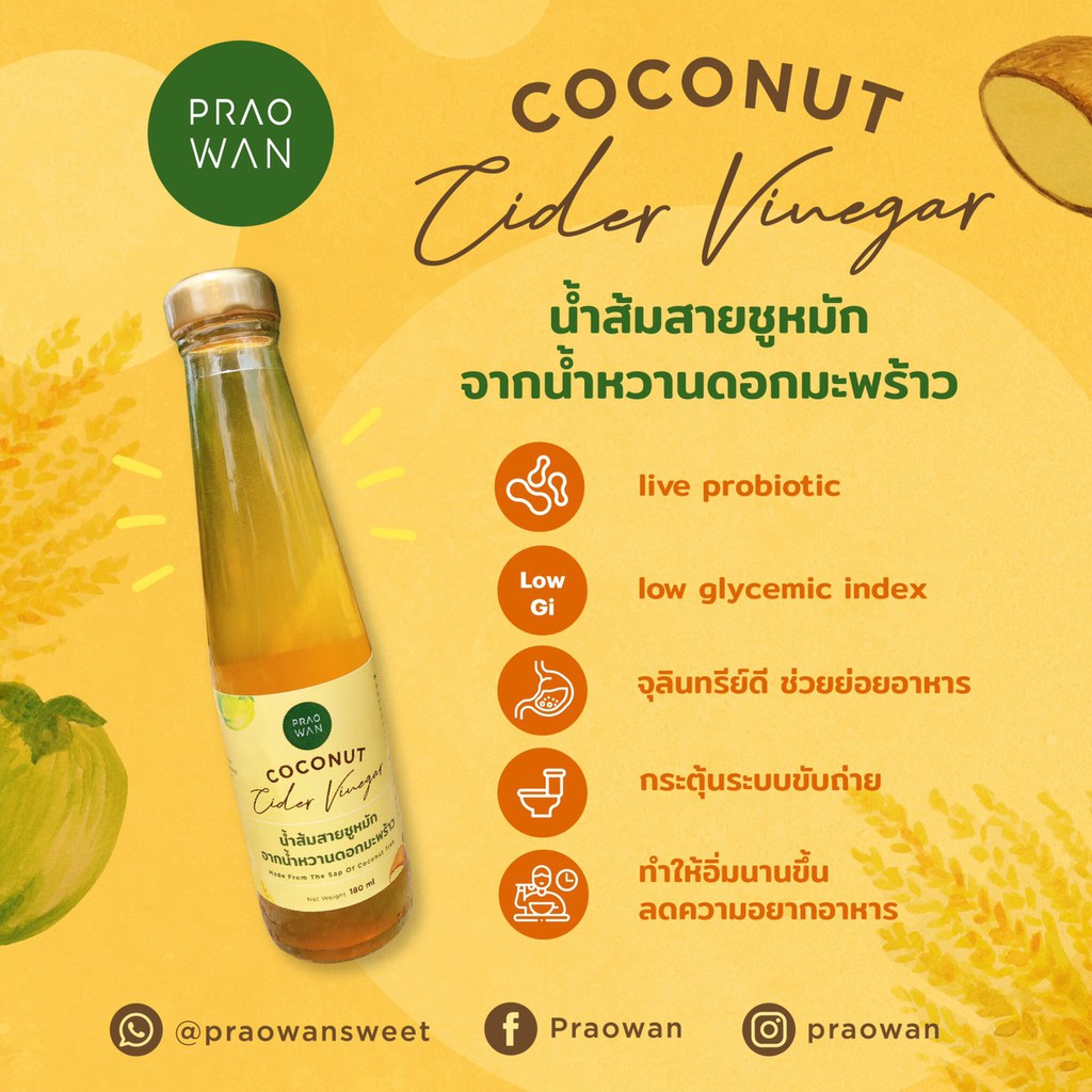 Praowan Coconut Cider Vinegar 180ml น้ำส้มสายชูหมักจากน้ำหวานดอกมะพร้าว