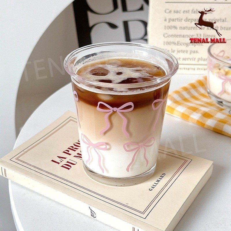 Home café แก้วน้ำแก้วกาแฟ ลายโบว์สีชมพู โปร่งใส ดีไซน์น่ารัก สำหรับตกแต่งและใช้งานจริง