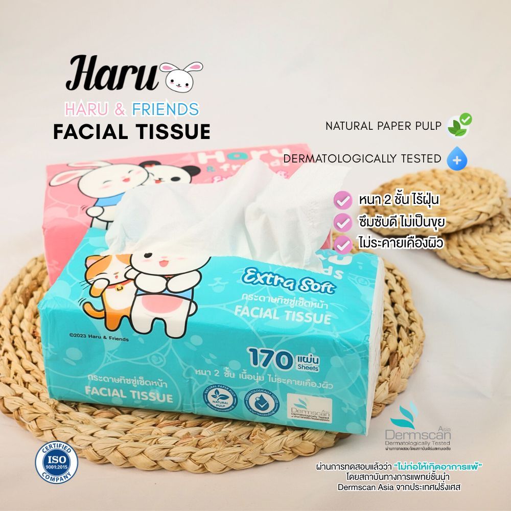 Haru - กระดาษเช็ดหน้า 170 แผ่น ยกลัง 50 ห่อ หนานุ่ม 2 ชั้น ซึมซับดี ไม่เป็นขุย อ่อนโยนต่อผิวหน้า