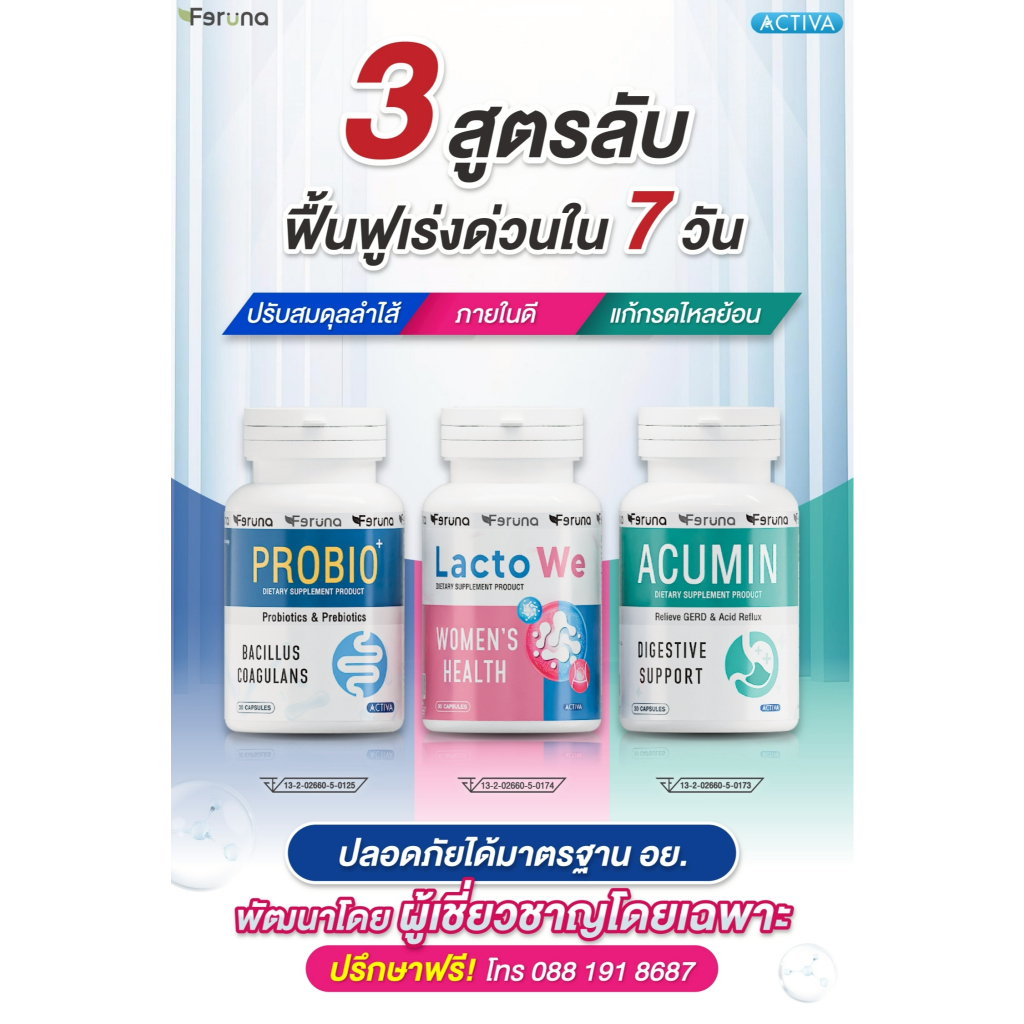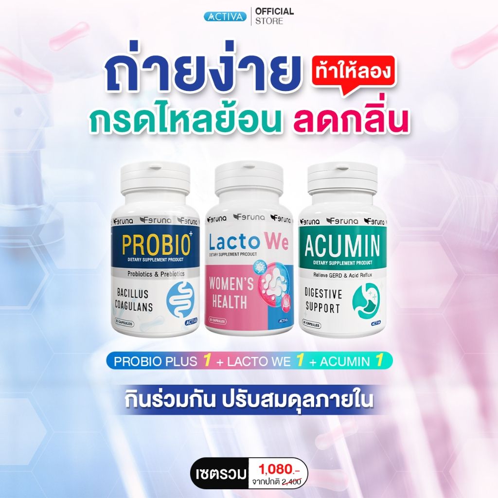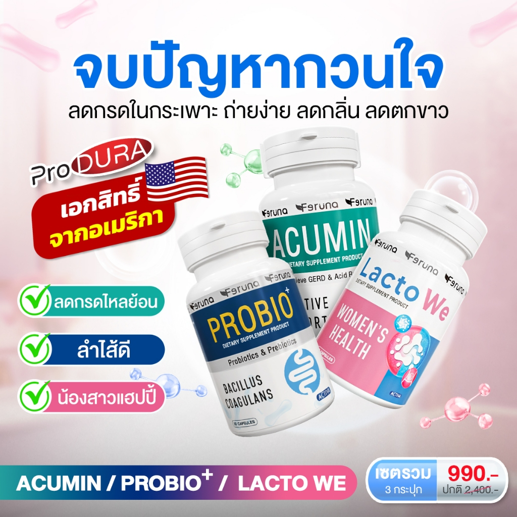 [SET] Feruna ฟีรูน่า เซตจบปัญหากวนใจ ปรับสมดุล ลดกรดในกระเพาะ ถ่ายง่าย ลดกลิ่น ลดตกขาว : Probio + LactoWe + Acumin